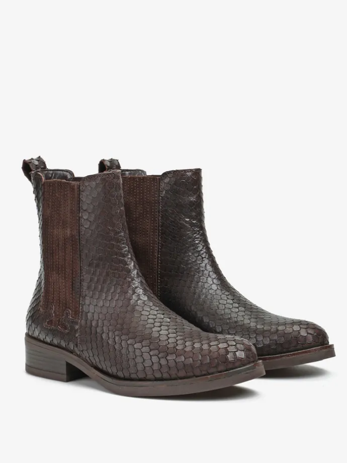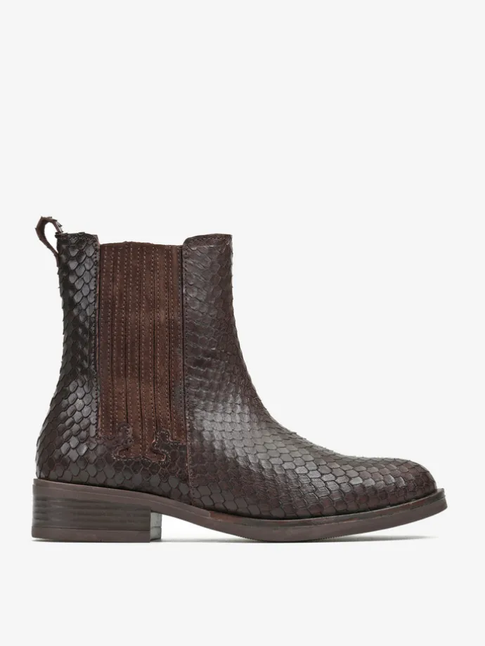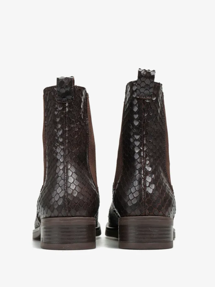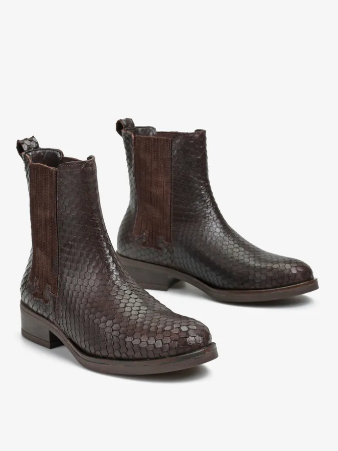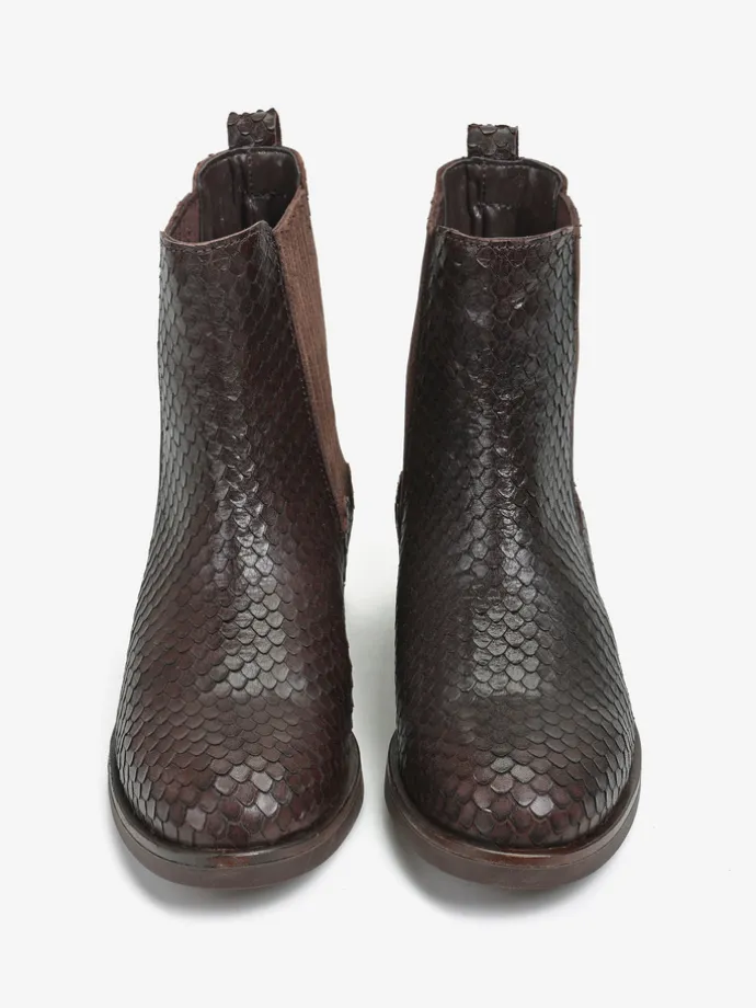 Sztyblety wykonane ze skóry tłoczonej w imitację łuski węża. Na cholewie elastyczne wstawki obszyte zamszowymi paskami.