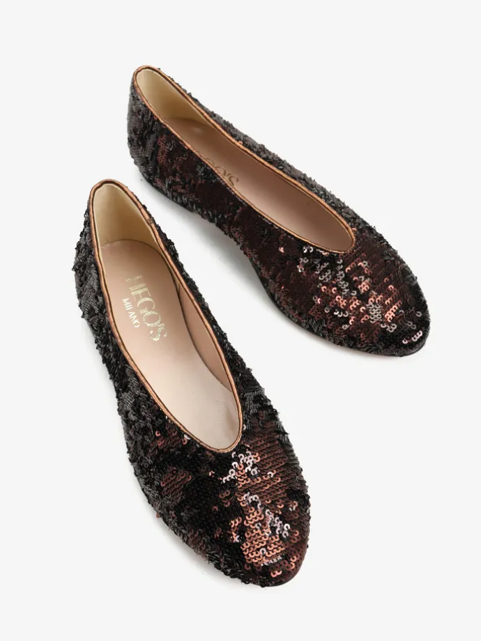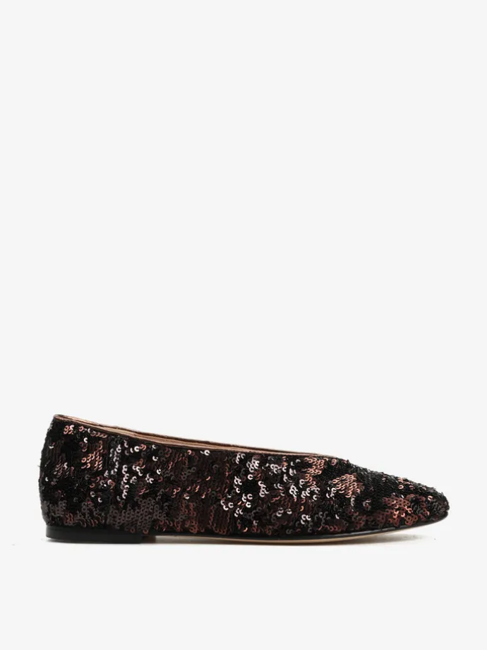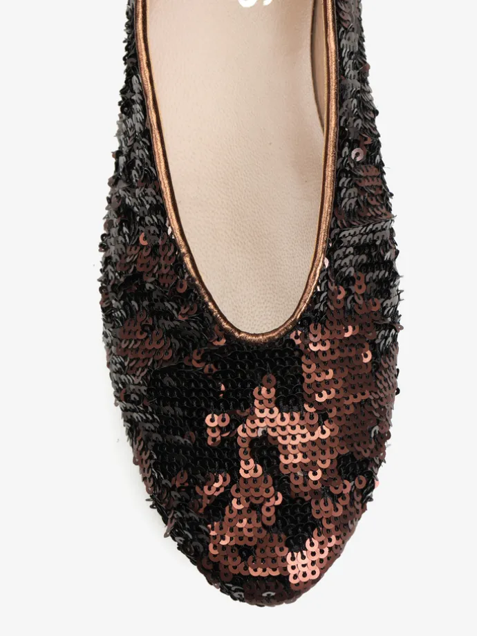Proste baleriny z owalnym wycięciem i zabudowanymi brzegami na skórzanej podeszwie. Wykończone dwustronnymi cekinami, które można układać.