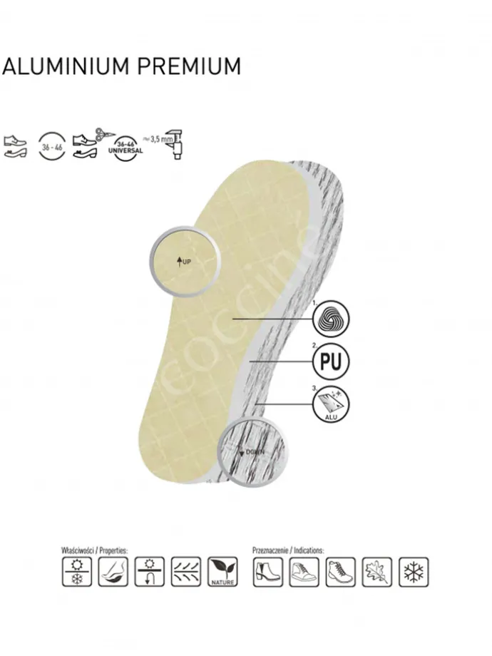 Wkładka termoizolacyjna. Charakteryzuje się pikowaniem na całej powierzchni, przedłużającym znacznie jej żywotność. Specjalna antypoślizgowa folia aluminiowa z klejem przytrzymuje wkładkę na miejscu. Warstwa wełny na piance zapewnia doskonałą izolację przed wilgocią i zimnem. Aluminium utrzymuje ciepło w obuwiu odbijając je z powrotem do wnętrza obuwia.