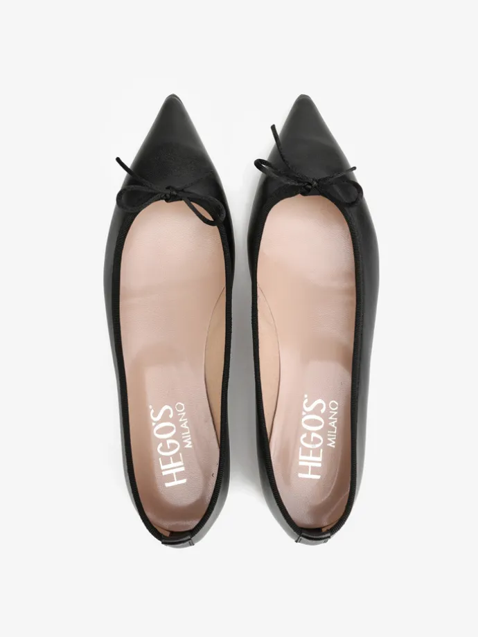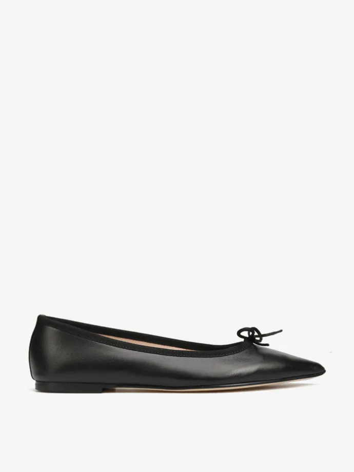 Baleriny z noskiem w szpic wykonane z wysokiej jakości skóry. Wiązana kokardka umożliwia regulację dopasowania.