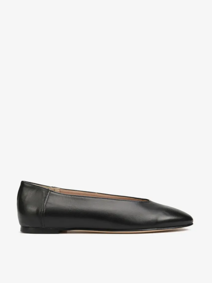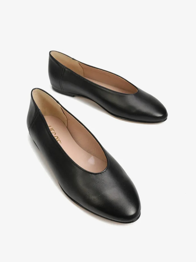 Proste baleriny z owalnym wycięciem i zabudowanymi brzegami na skórzanej podeszwie, wykonane z delikatnej, miękkiej skóry.