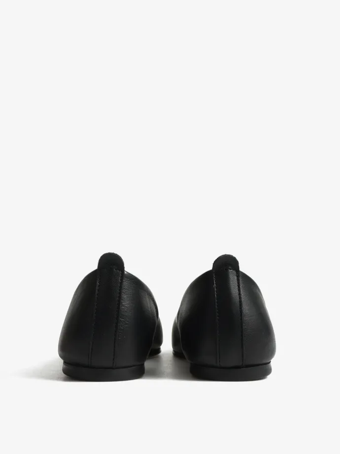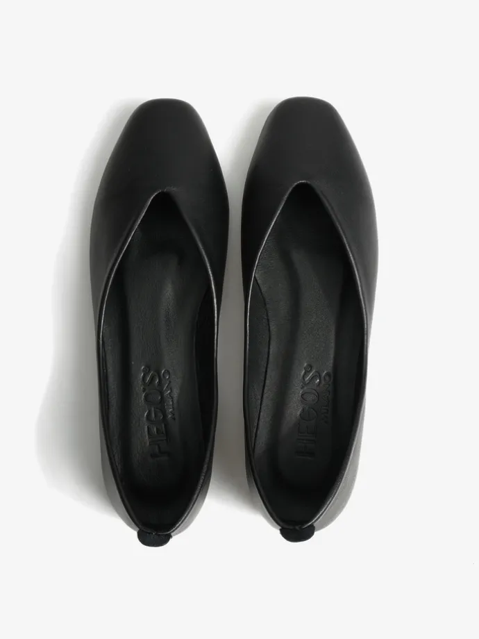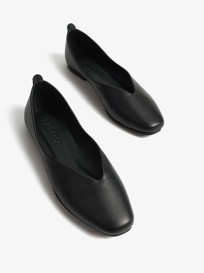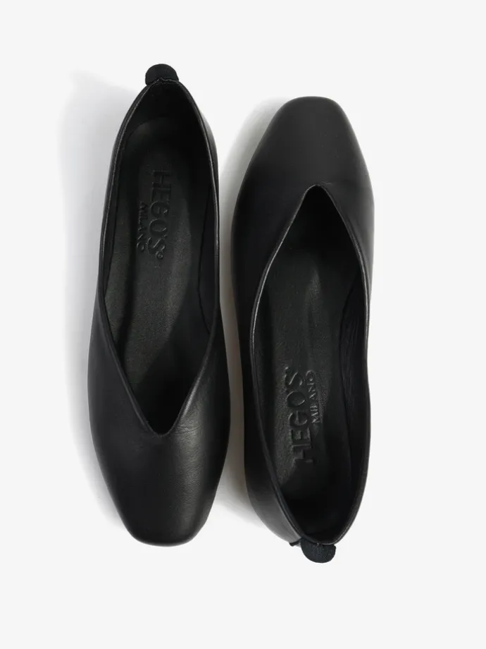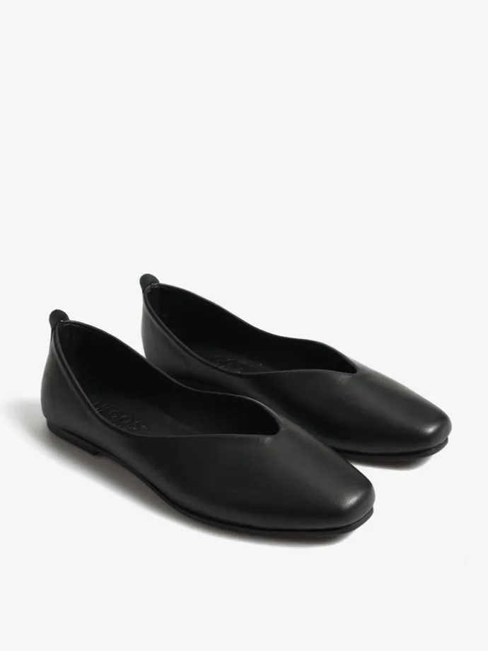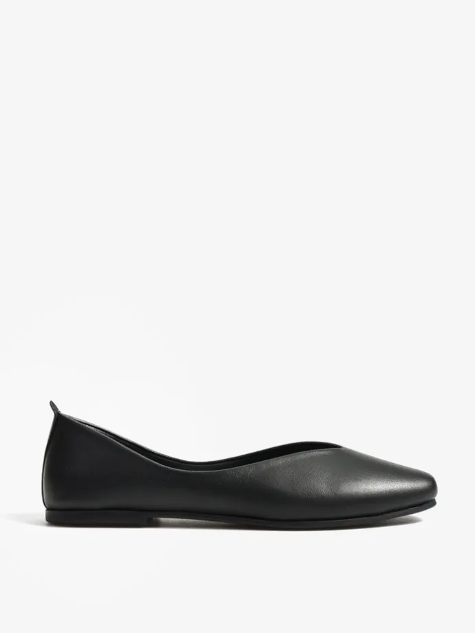 Baleriny wykonane z delikatnej, miękkiej skóry. Kwadratowy nosek i głębokie wycięcie w szpic.
