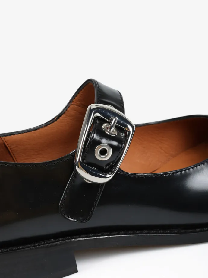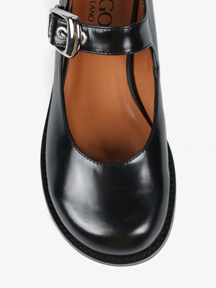 Baleriny Mary Jane na niskim obcasie, wykonane z wysokopolerowanej skóry. Okrągłe noski i regulowany pasek.
