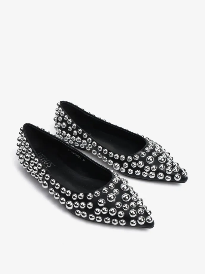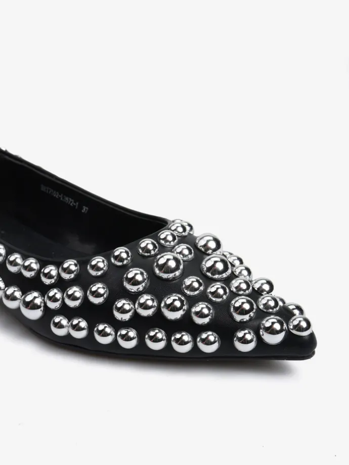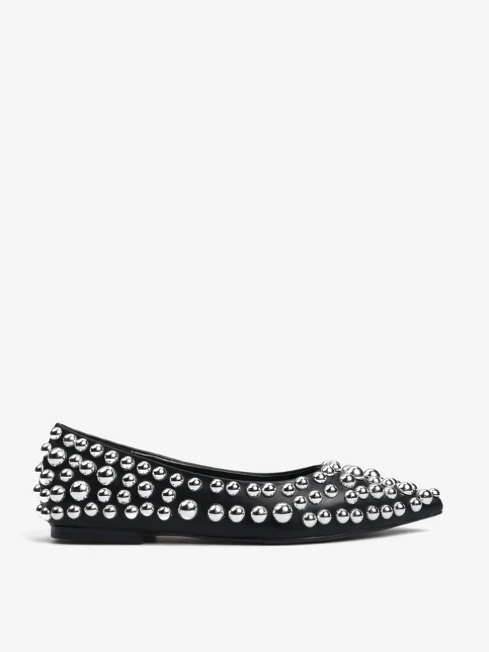Czarne baleriny z noskiem w szpic. Ozdobne metalowe ćwieki.