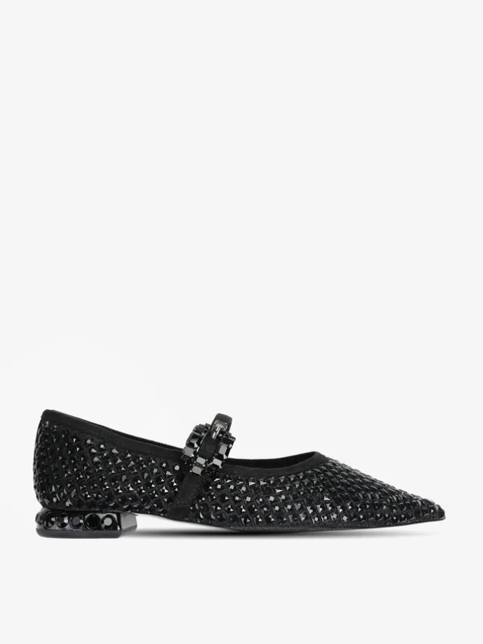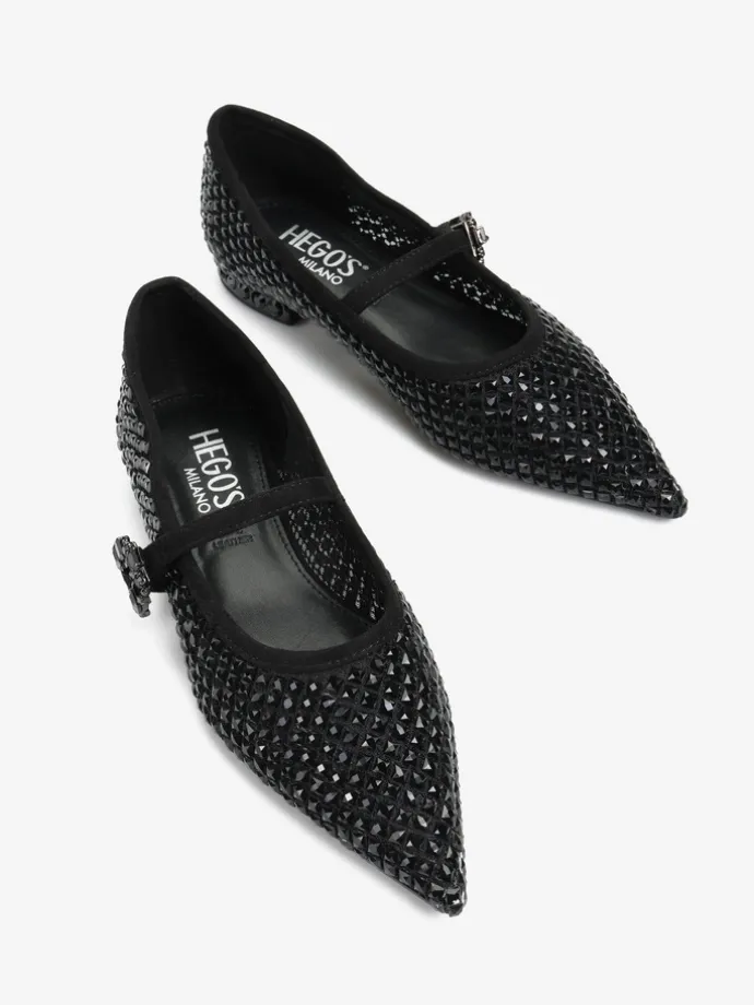 Baleriny Mary Jane wykonane z siateczki zdobionej kryształkami. Noski w szpic, niski obcas i regulowany pasek.