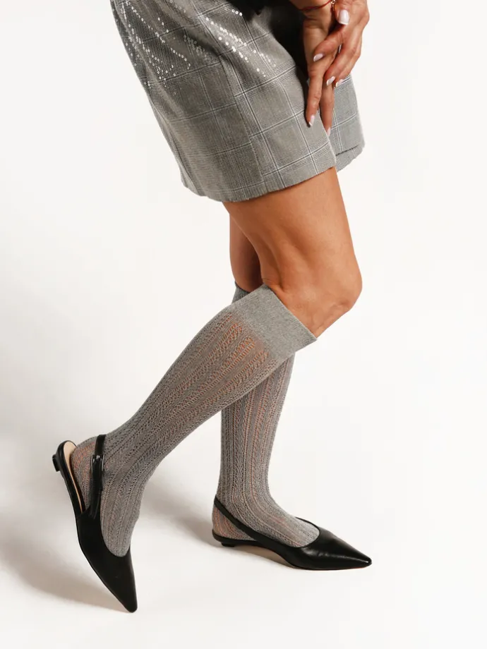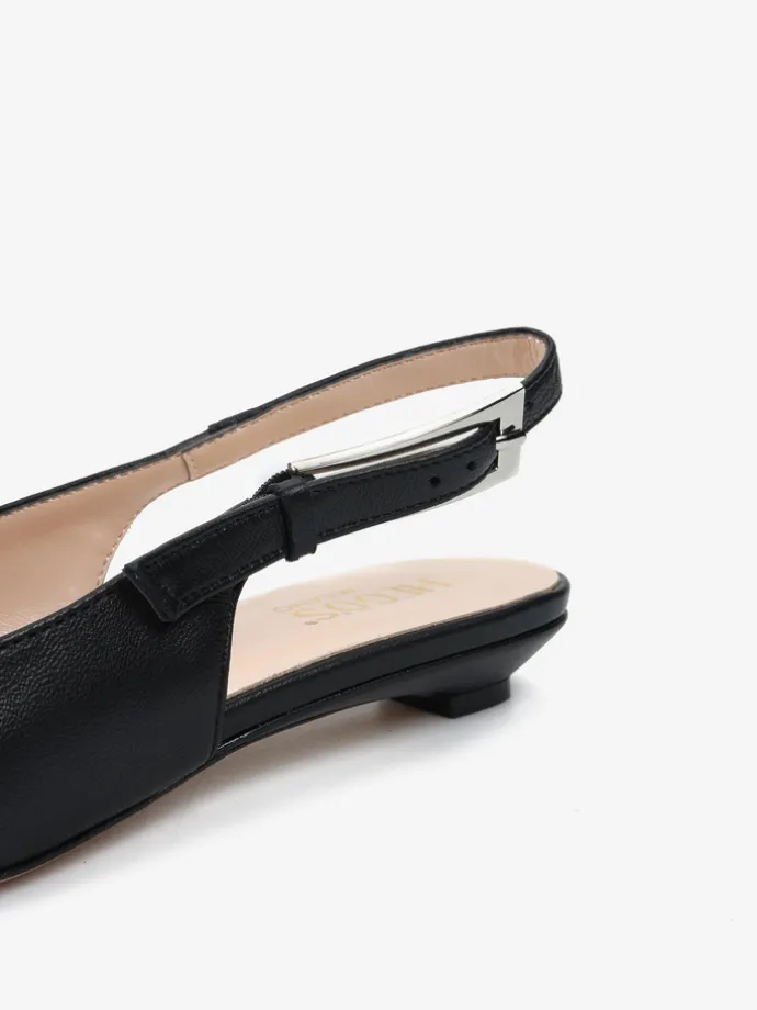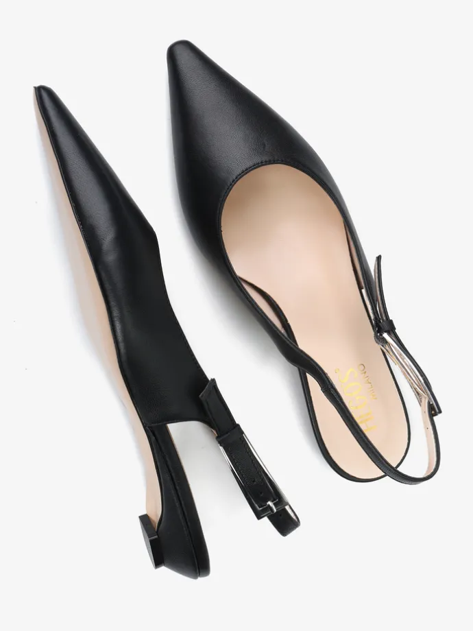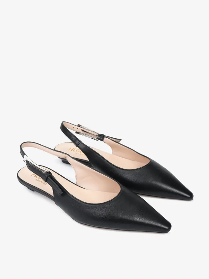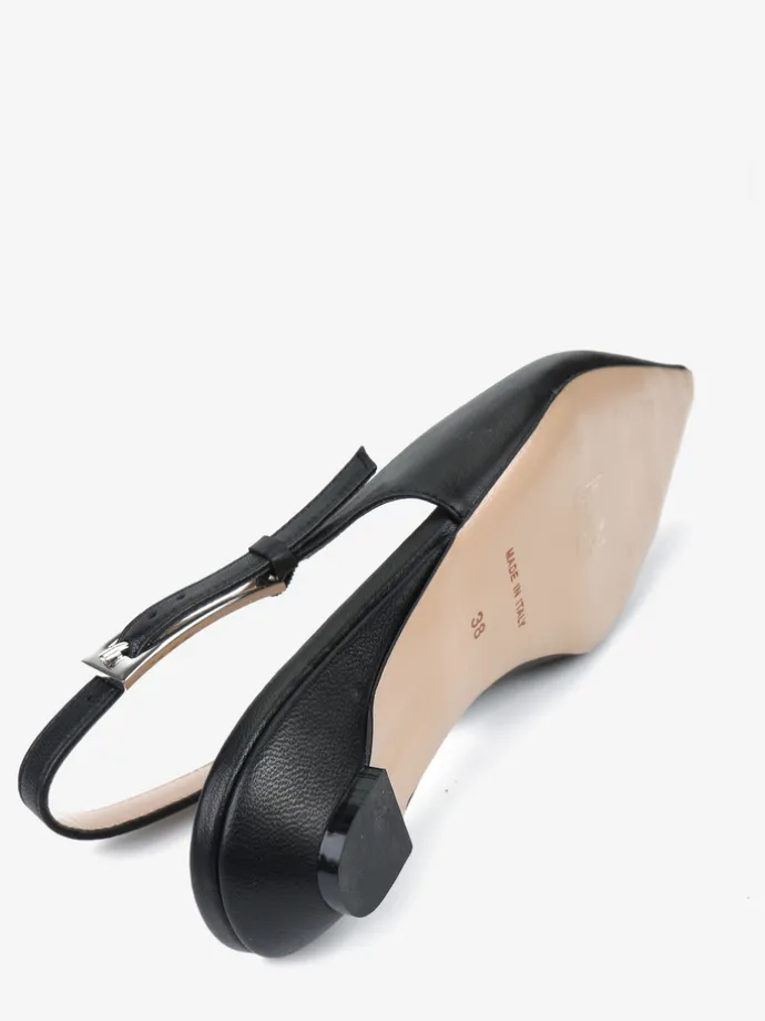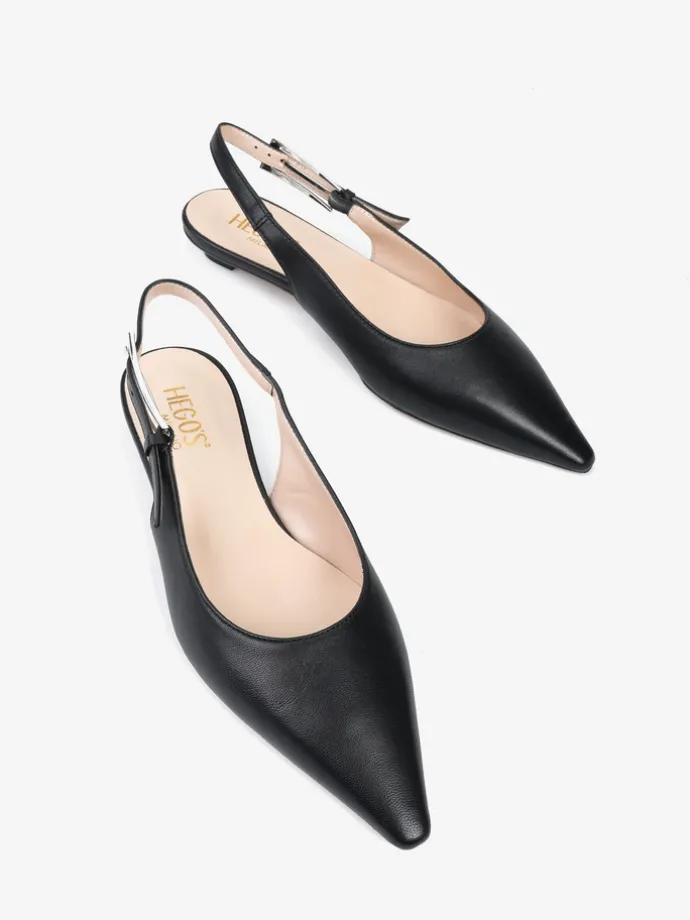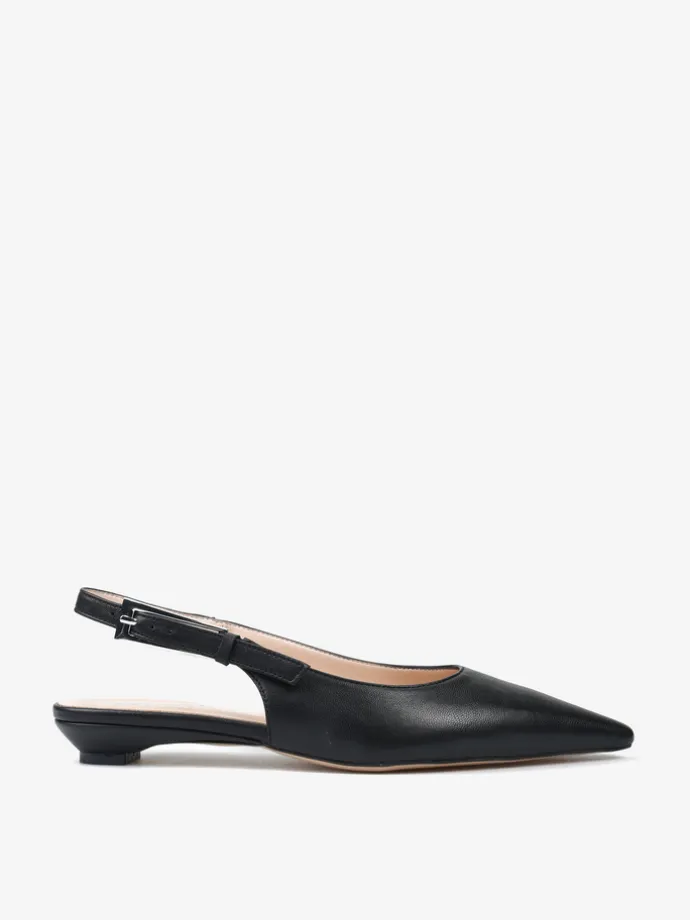 Baleriny z noskiem w szpic wykonane z delikatnej, miękkiej skóry. Odkryta pięta z regulowanym paskiem i ozdobnym zapięciem.