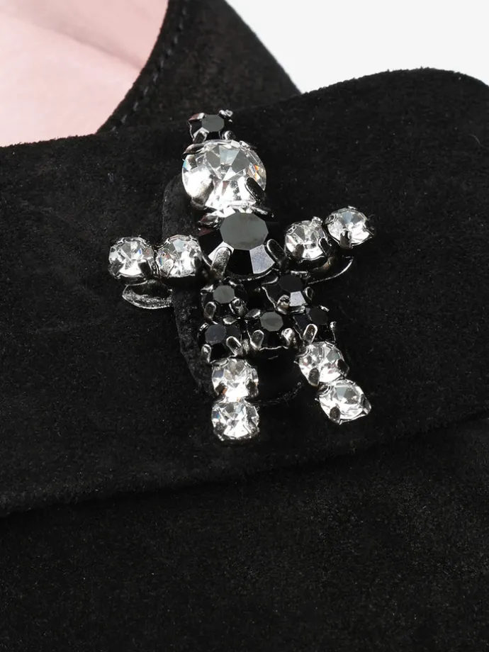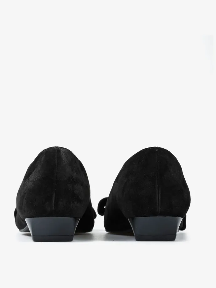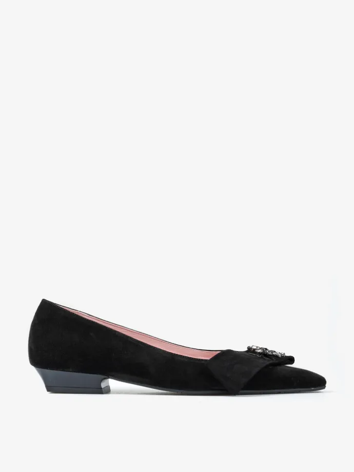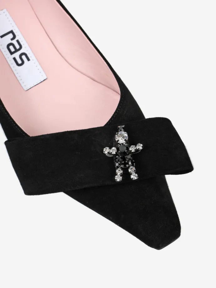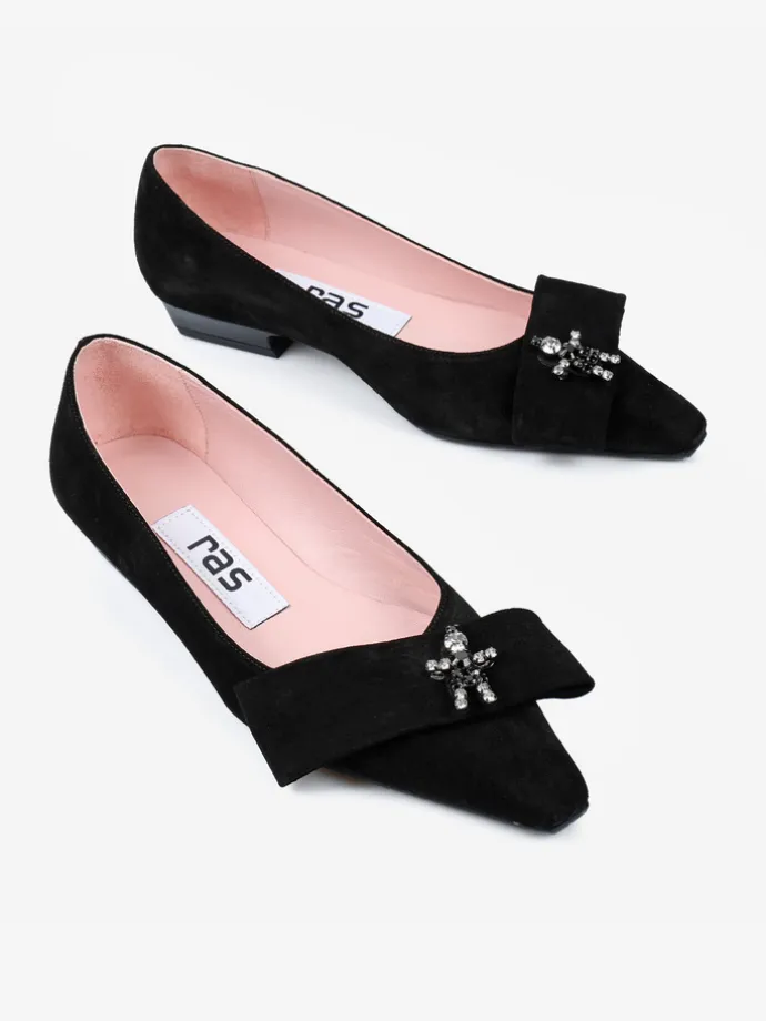 Zamszowe baleriny RAS na niskim obcasie. Nosek w szpic z ozdobnym, zamszowym paskiem i biżuteryjną aplikacją.