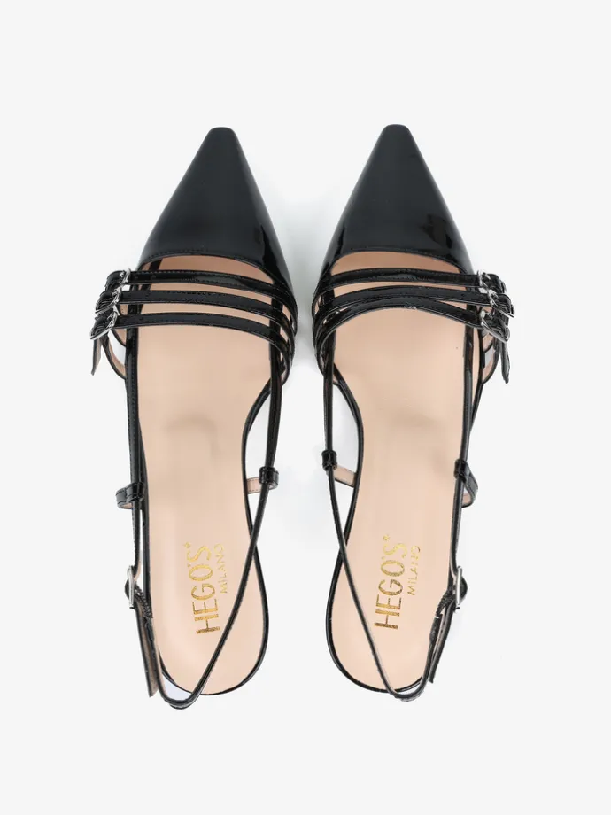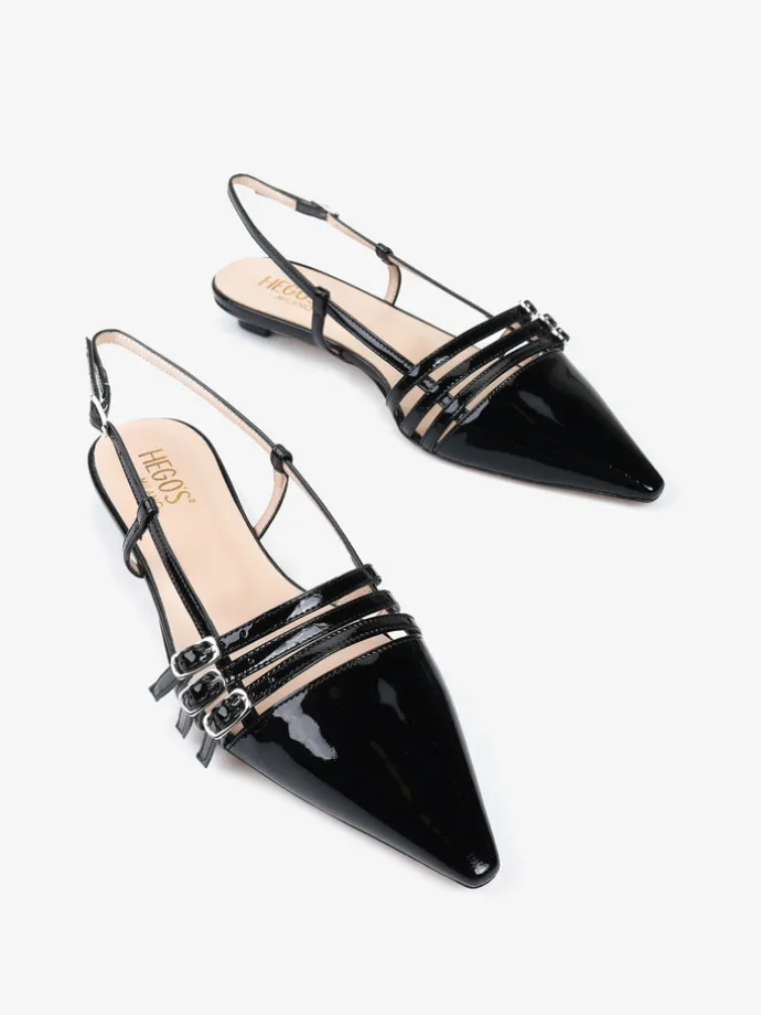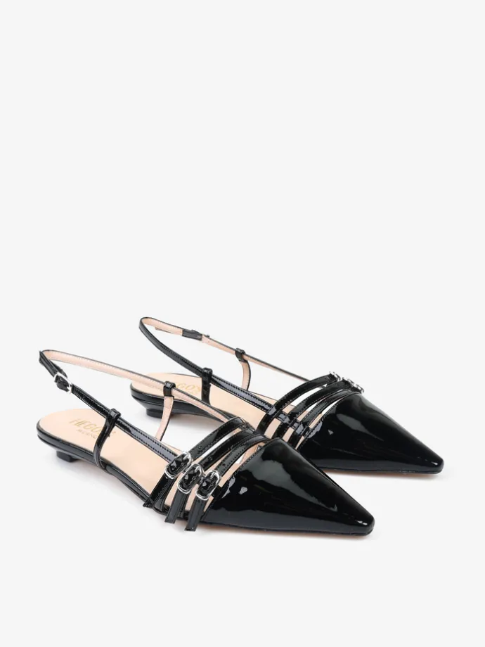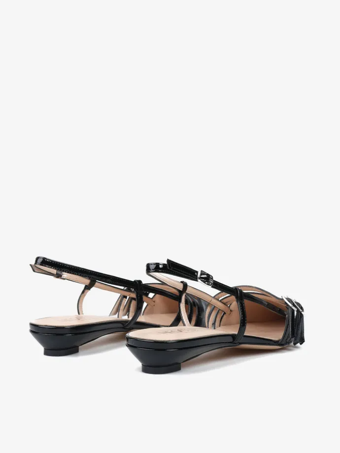 Baleriny z noskiem w szpic i odkrytą piętą z regulowanym paskiem. Ozdobne paseczki.