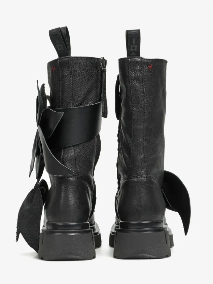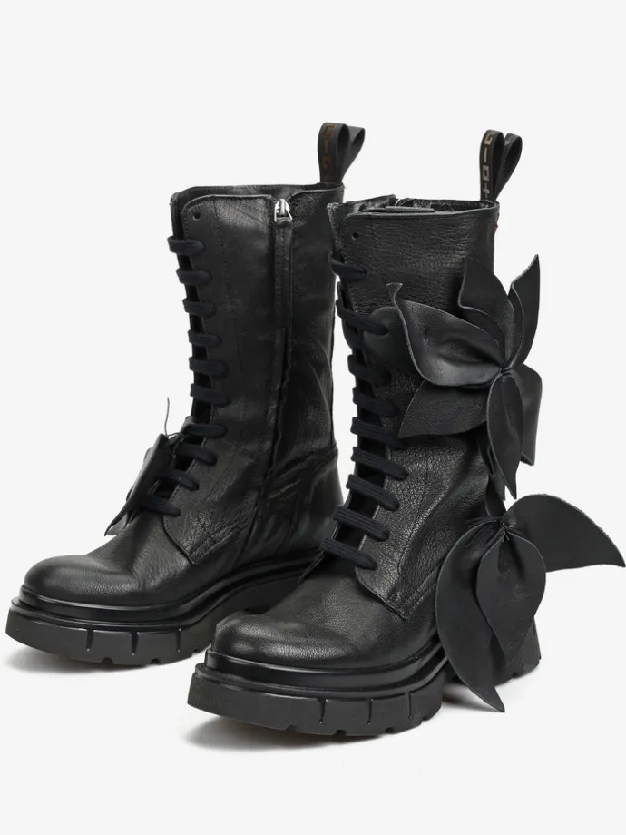 Skórzane botki GIO+ na grubej podeszwie. Wysoka cholewa z zapięciem na suwak. Ozdobne, skórzane kwiaty.