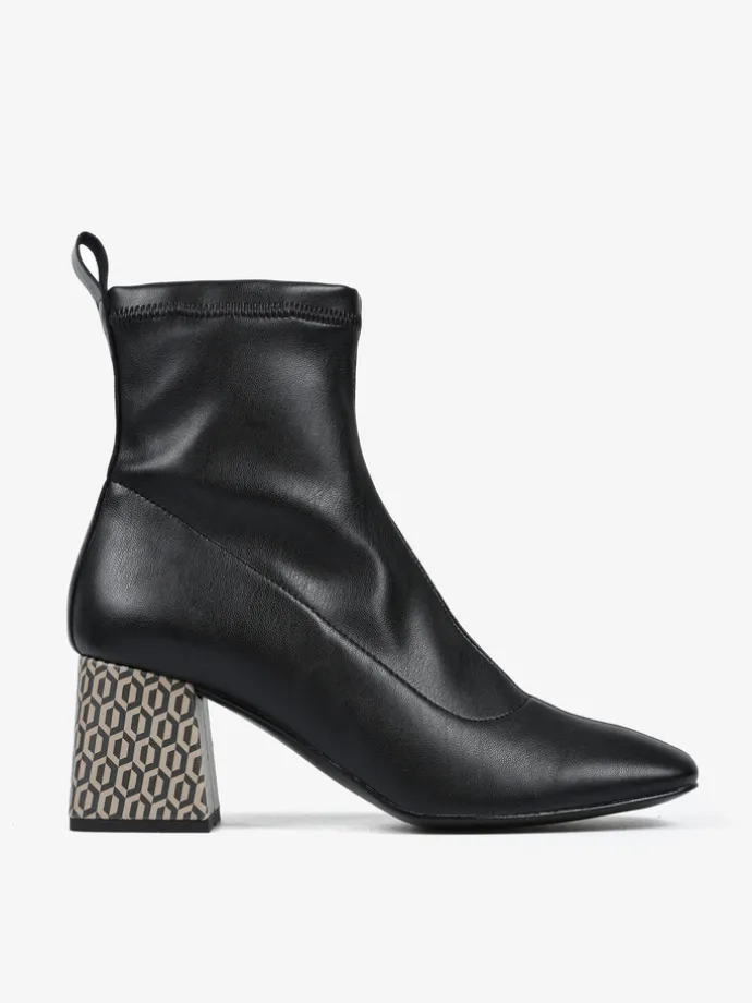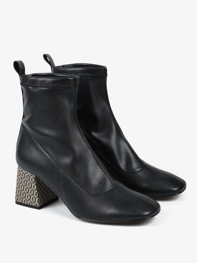 Wsuwane botki z kwadratowymi noskami. Efektowny słupek w geometryczny wzór.