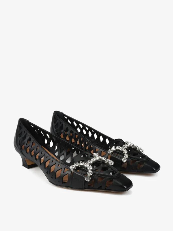 Miękkie, skórzane czółenka na niskim obcasie z ozdobną aplikacją. Wydłużony, kwadratowy nosek.