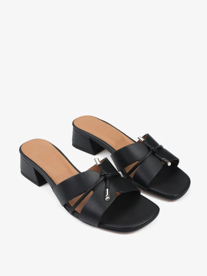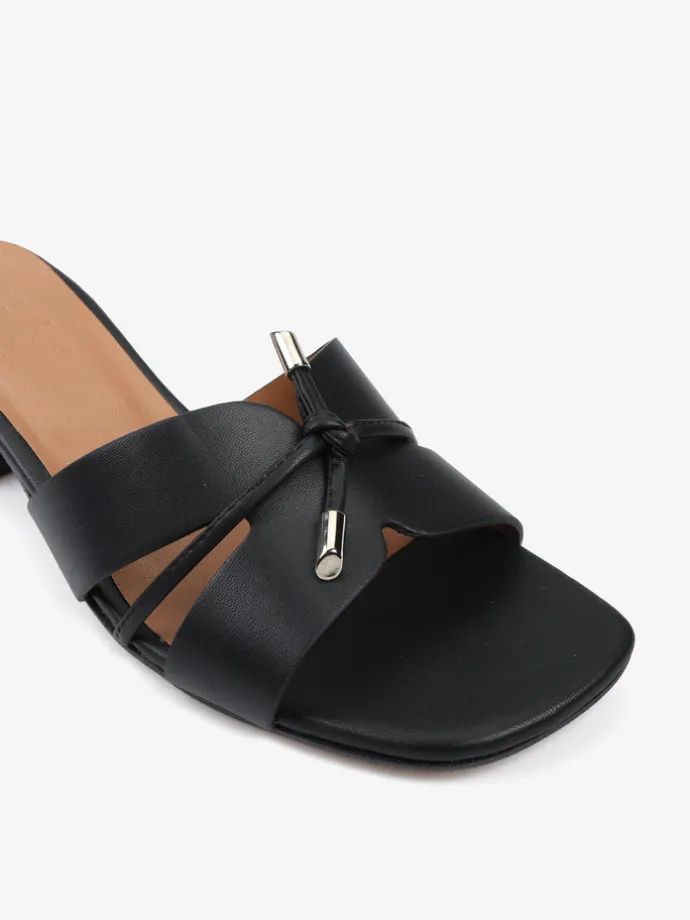 Modne klapki na niskim obcasie. Ozdobne wiązanie ze skórzanego sznurka wykończonego metalowymi skuwkami. Wykonane z miękkiej, delikatnej skóry.