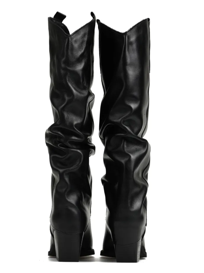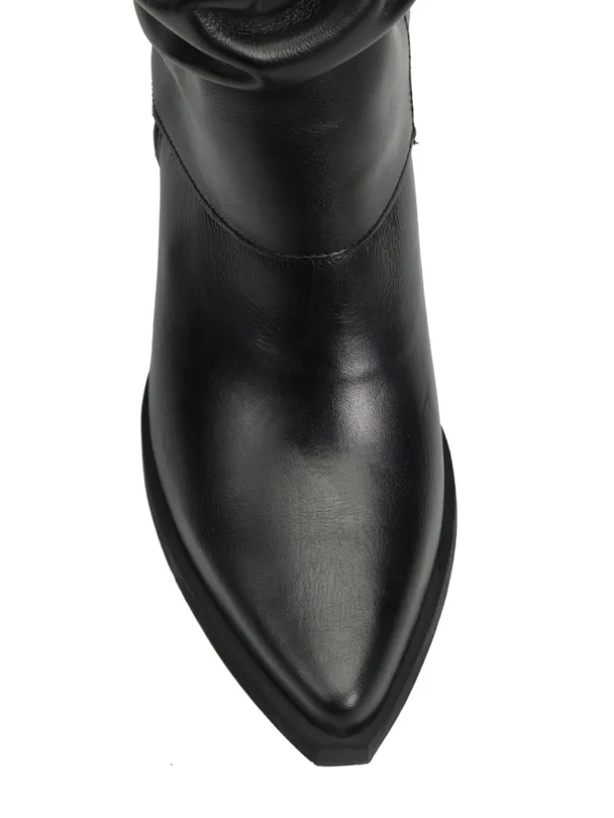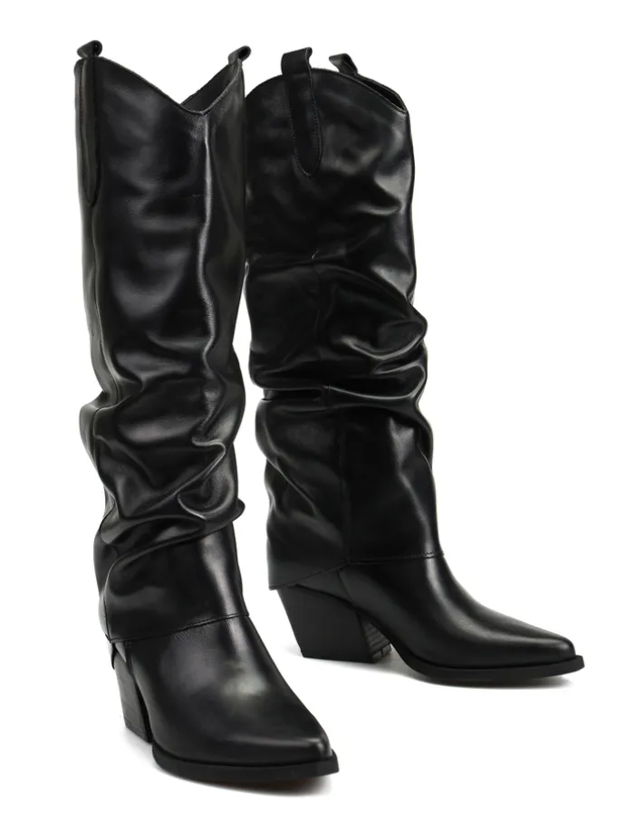 Skórzane kowbojki z przedłużoną, marszczoną cholewką. Noski w szpic.