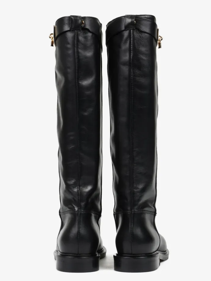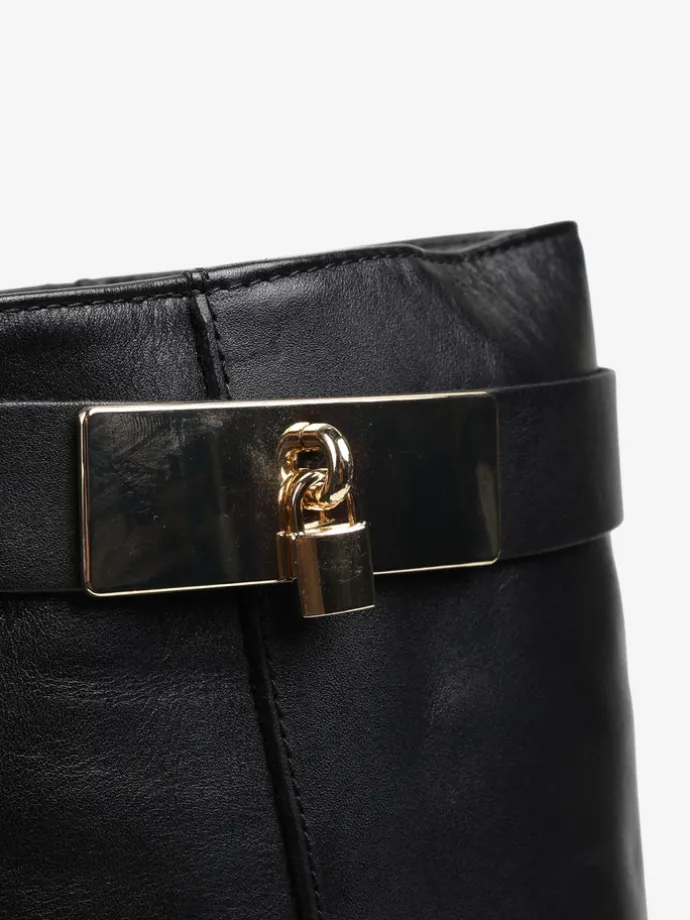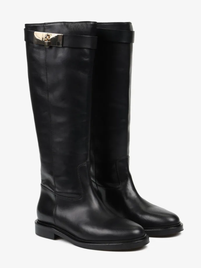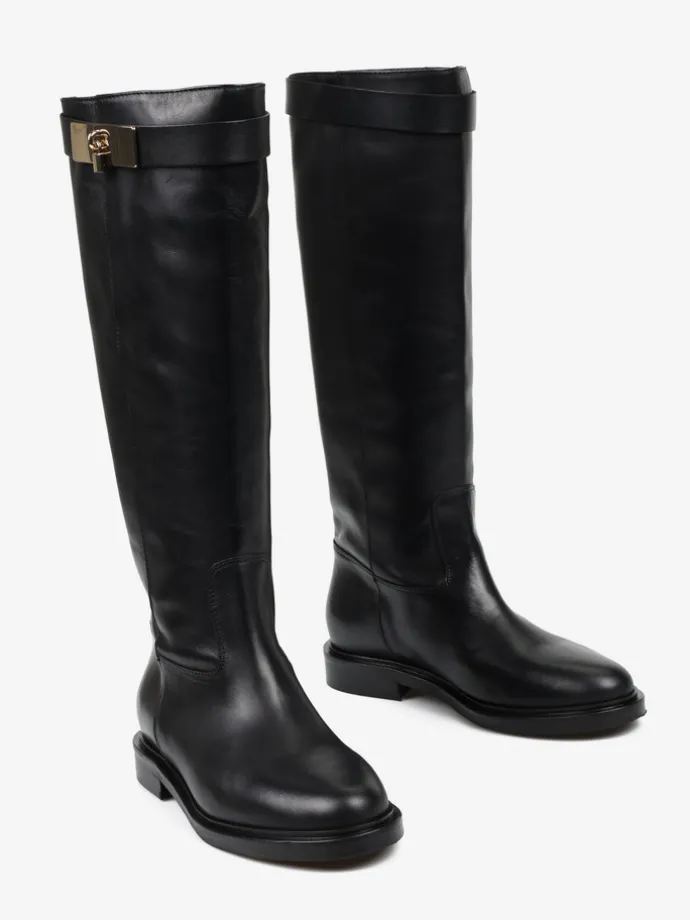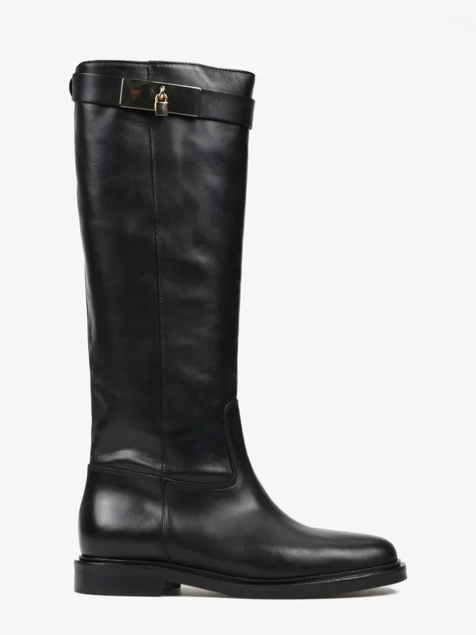 Wsuwane, klasyczne oficerki. Ozdobny pasek ze złotą kłódką na cholewie.