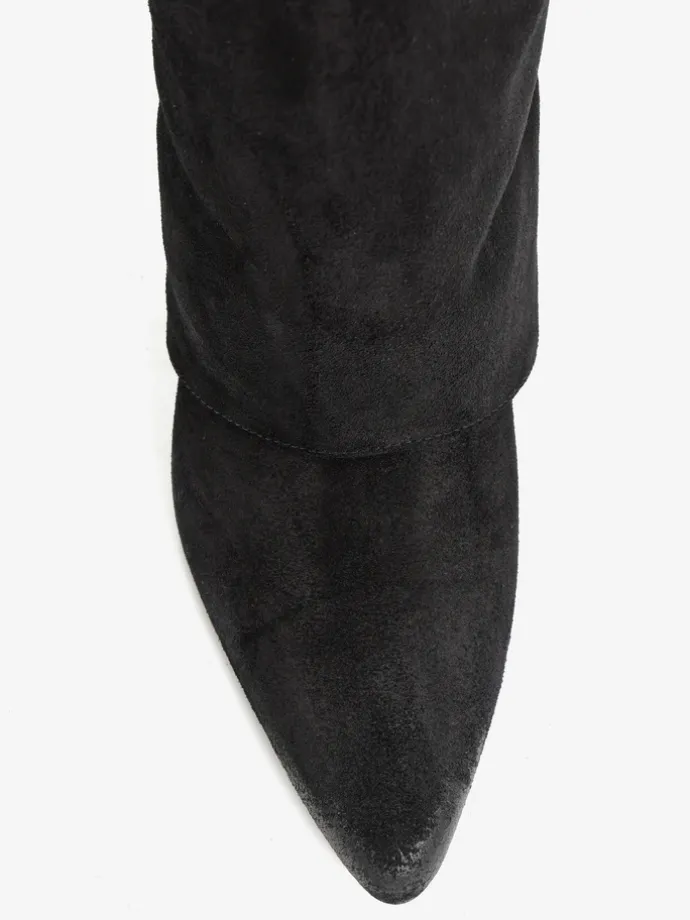 Zamszowe kozaki na koturnie z noskami w szpic. Przedłużona cholewka i ozdobny pasek ze złotą sprzączką.