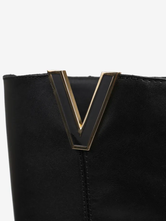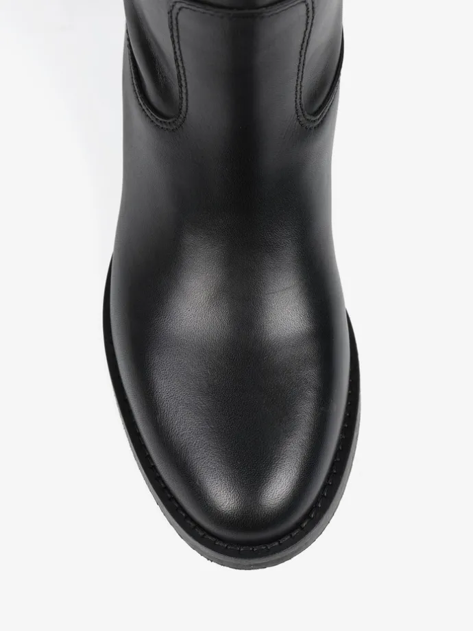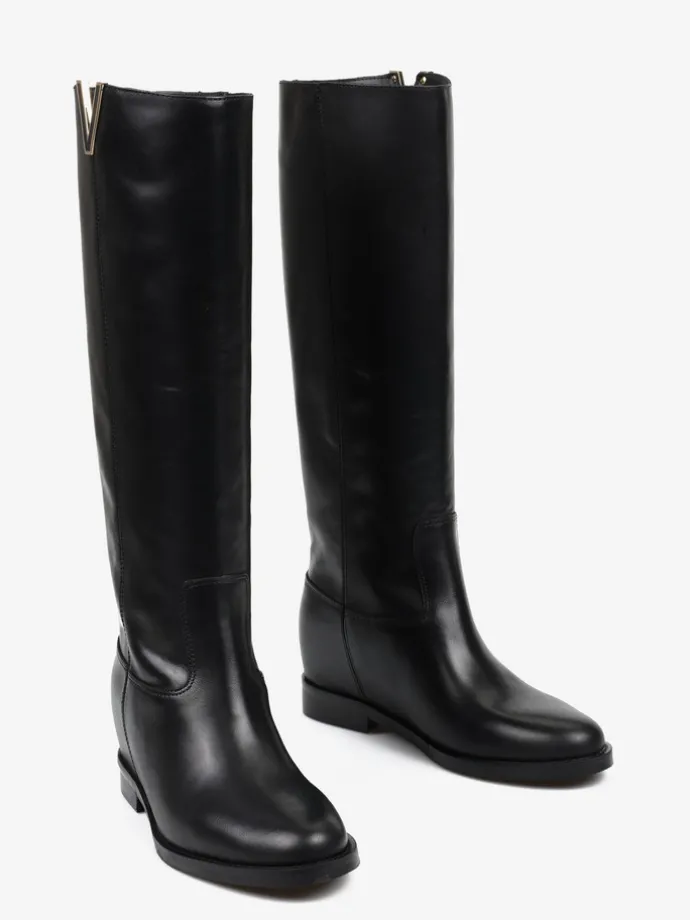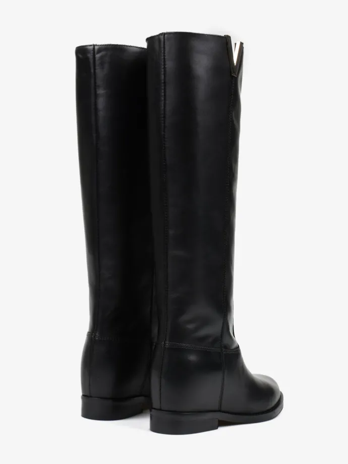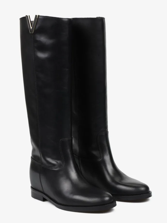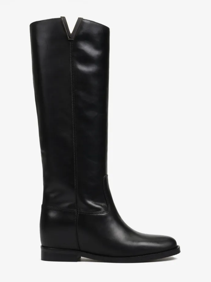 Kozaki wykonane są z naturalnej, włoskiej skóry. Prosta cholewka w ponadczasowym, czarnym kolorze wykonćzona metalowym elementem. Model posiada ukryty koturn. Klasyczny, prosty fason będzie uzupełnieniem Twojej garderoby.