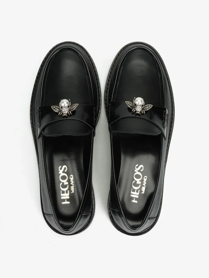 Czarne mokasyny wykonane z miękkiej, delikatnej skóry. Połyskująca patka z biżuteryjną aplikacją.