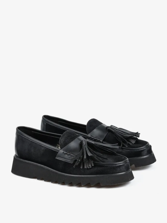 Czarne mokasyny na efektownej podeszwie wykonane z naturalnej skóry z włosiem. Ozdobna patka z frędzlami.
