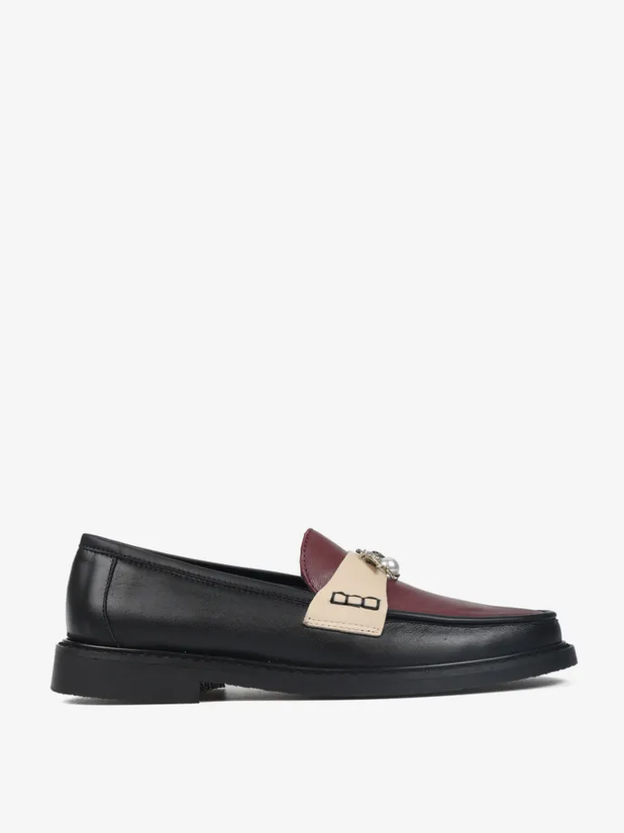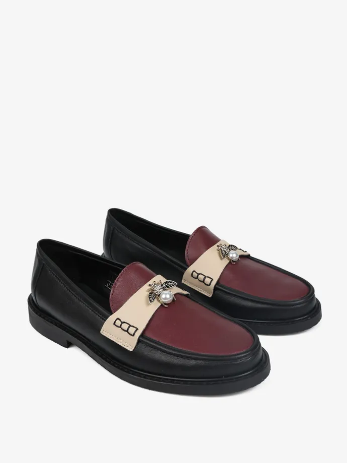 Mokasyny z kontrastującym, bordowym językiem wykonane z miękkiej i delikatnej skóry. Beżowa patka z biżuteryjną aplikacją.