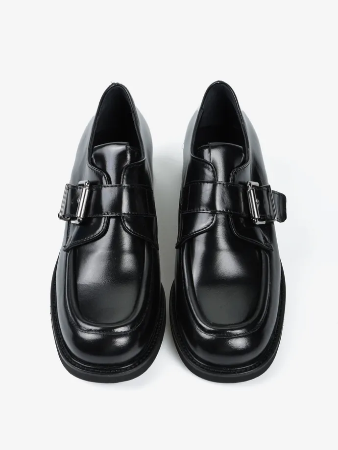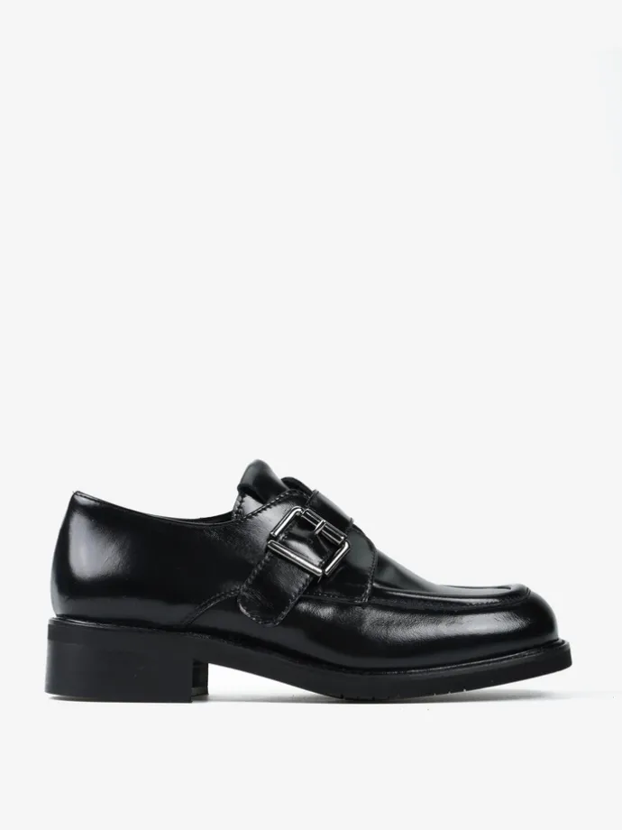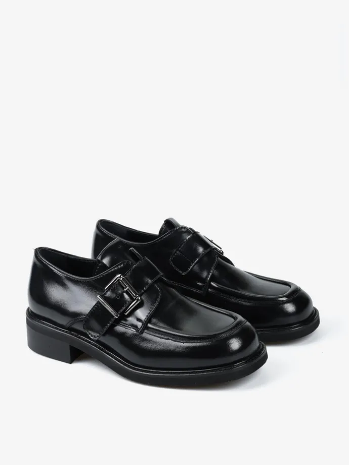 Czarne półbuty na niskim obcasie wykonane ze skóry wysoko polerowanej. Kwadratowe noski i regulowane zapięcie.