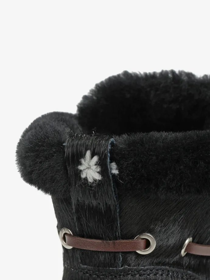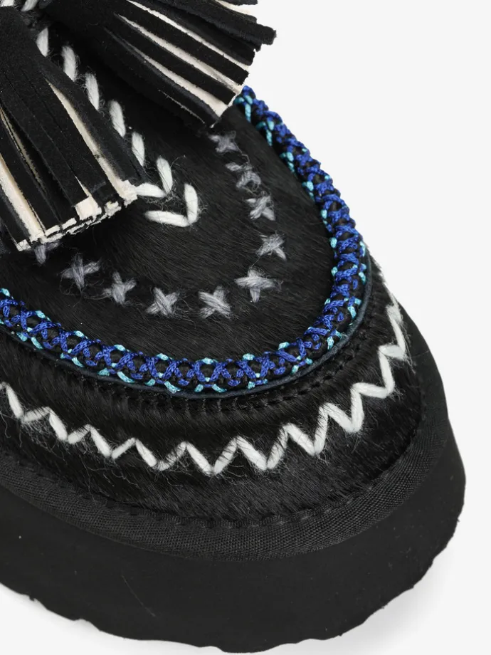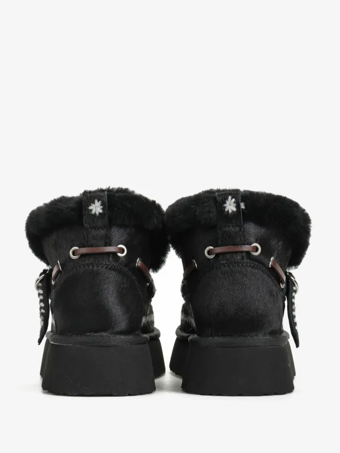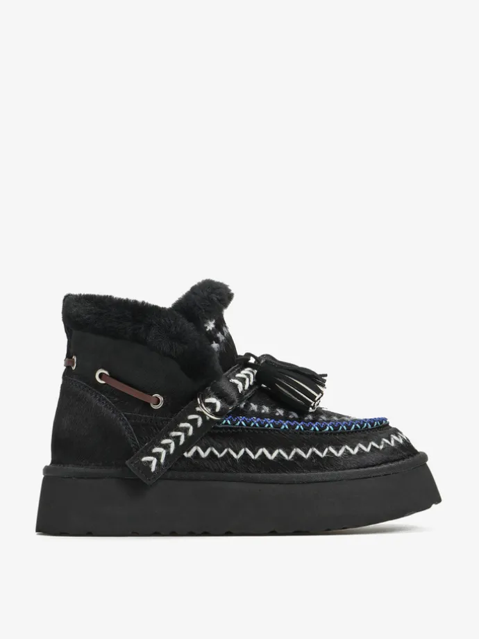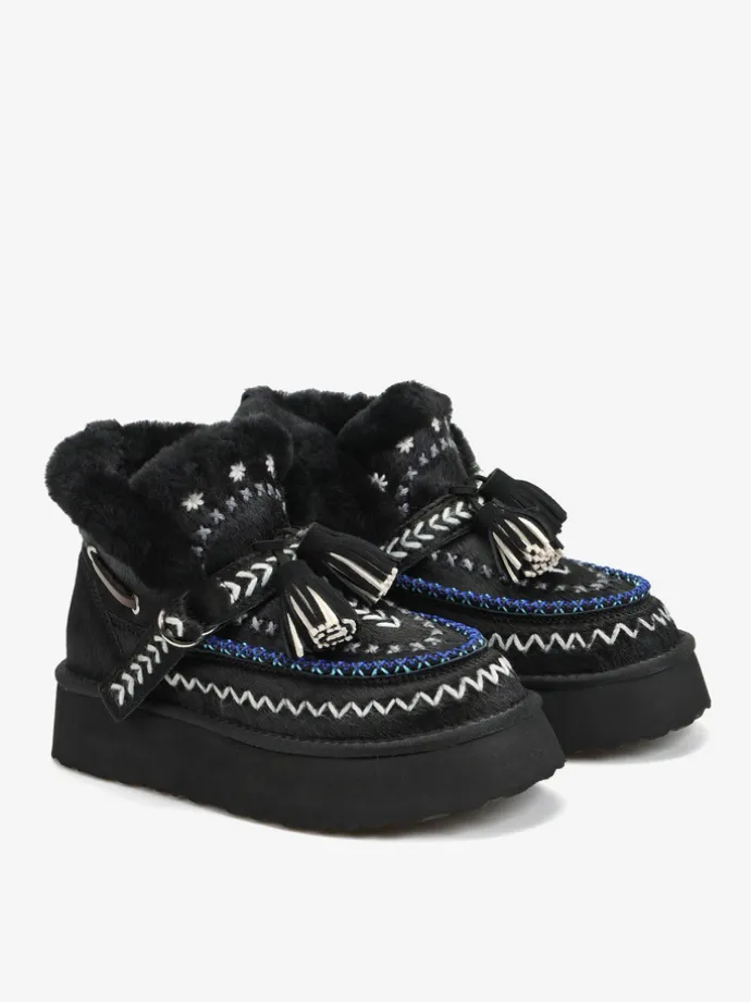 Śniegowce na wysokiej platformie wykonane z naturalnej skóry z włosiem. Ozdobne hafty i regulowany pasek z frędzlami. Wnętrze wyłożone miękką, naturalną wełną owczą.