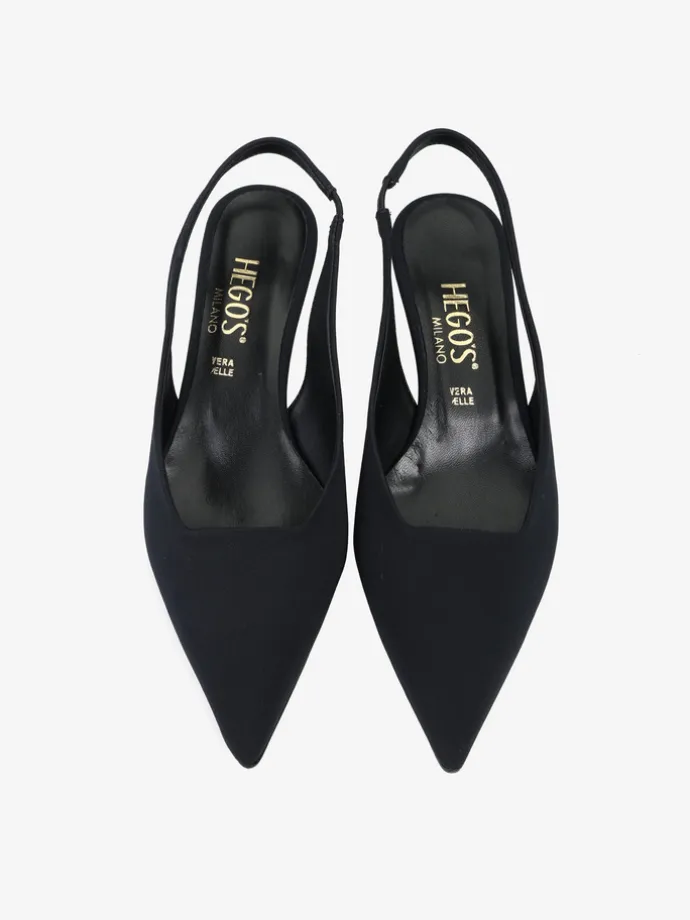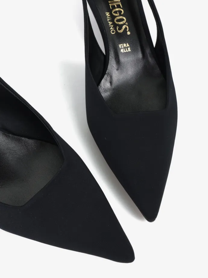 Szpilki z noskiem w szpic, wykonane z tkaniny. Odkryta pięta z paskiem dopasowującym się do stopy.