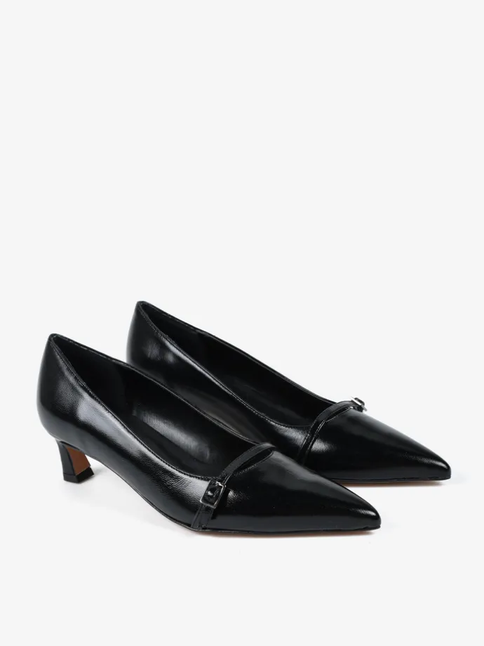 Eleganckie szpilki wykonane ze skóry lakierowanej. Nosek w szpic z ozdobnym paseczkiem.
