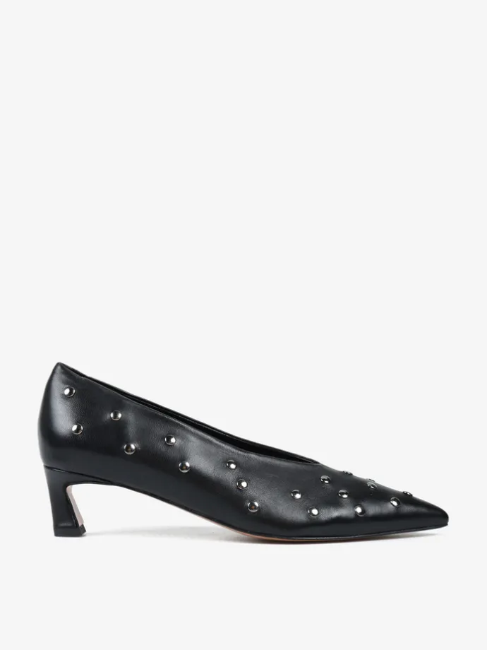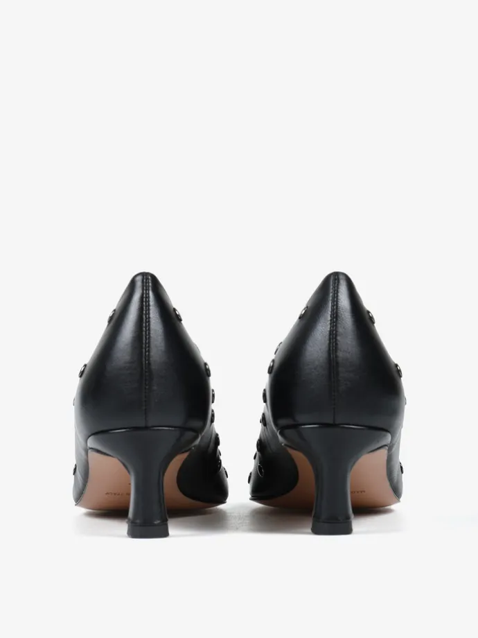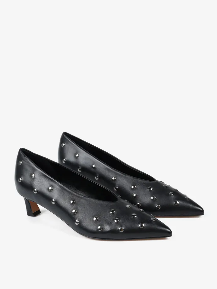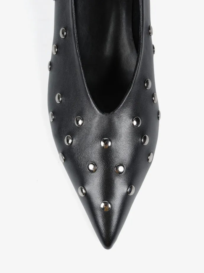 Niskie szpilki z zabudowanymi brzegami, noskiem w szpic i ozdobnymi ćwiekami.