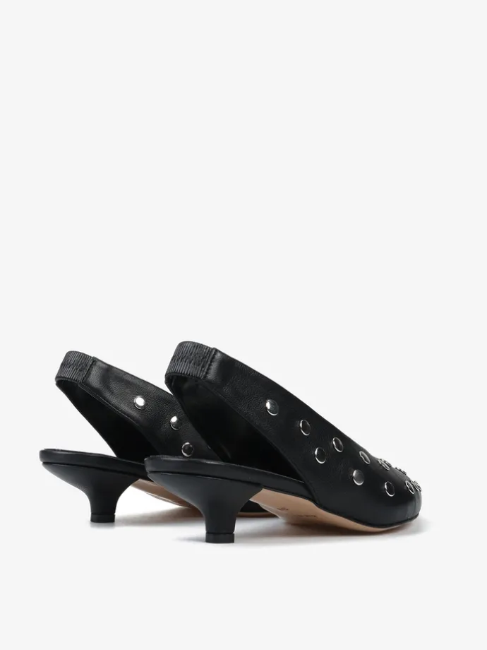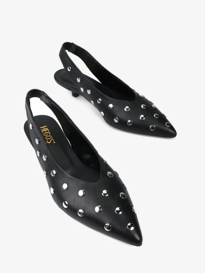 Szpilki z noskiem w szpic ze srebrnymi ćwiekami. Odkryta pięta z paskiem dopasowującym się do stopy.