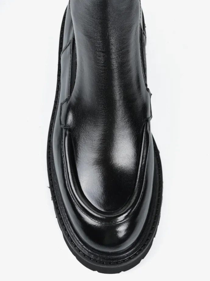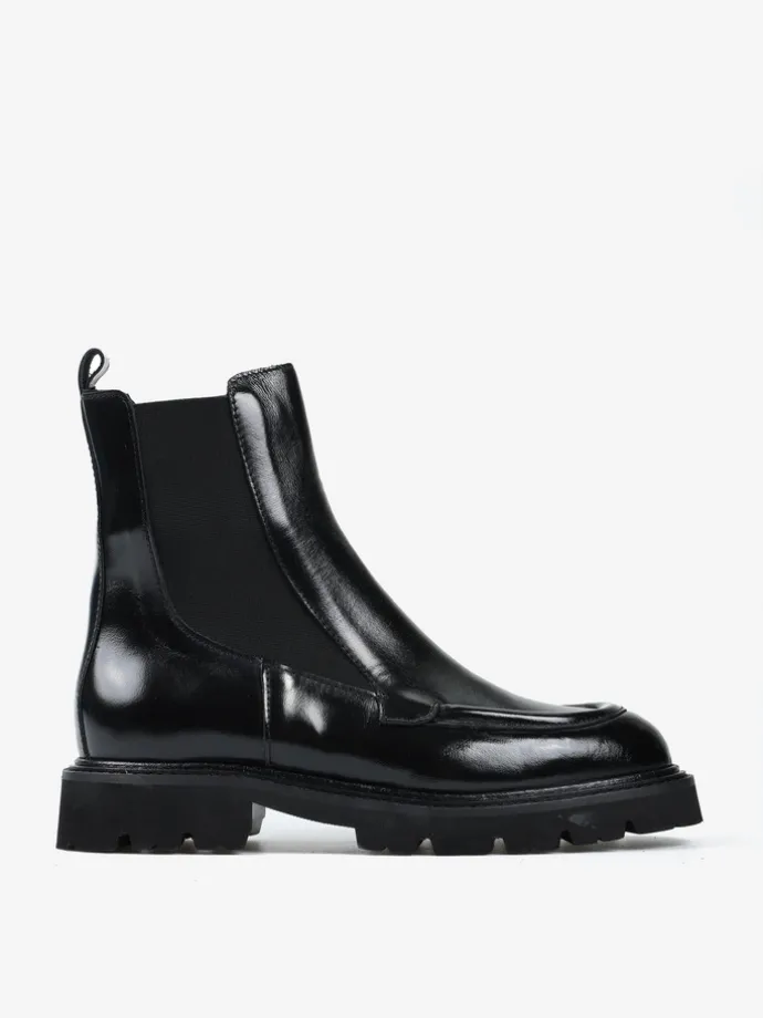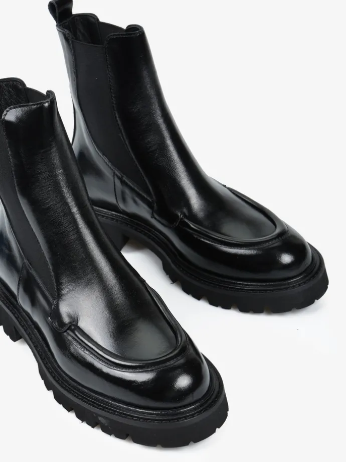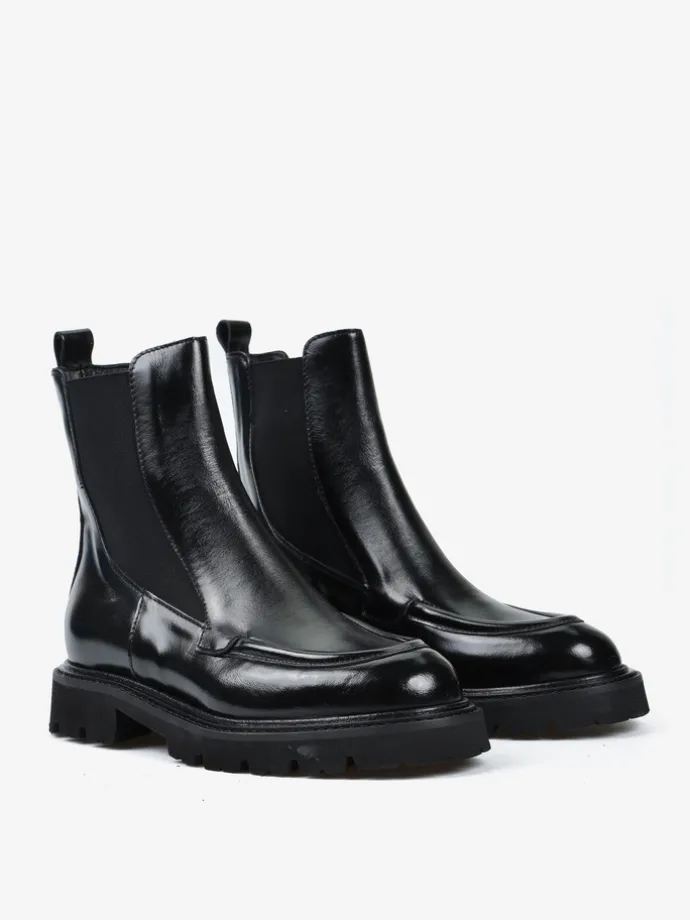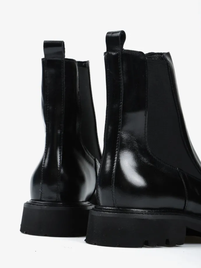 Klasyczne sztyblety na grubszej podeszwie wykonane z wysoko polerowanej skóry.