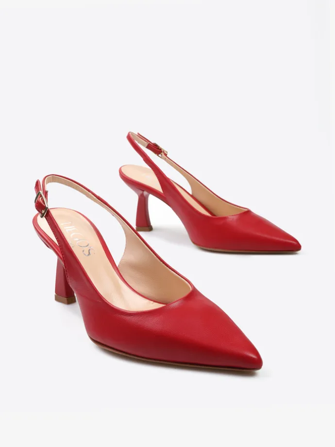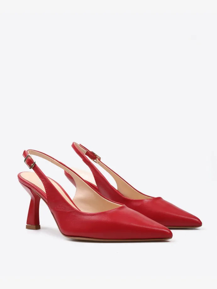 Klasyczne szpilki z noskiem w szpic wykonane z miękkiej, delikatnej skóry. Odkryta pięta z regulowanym paskiem.