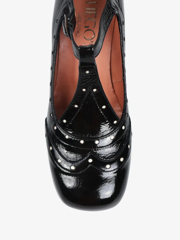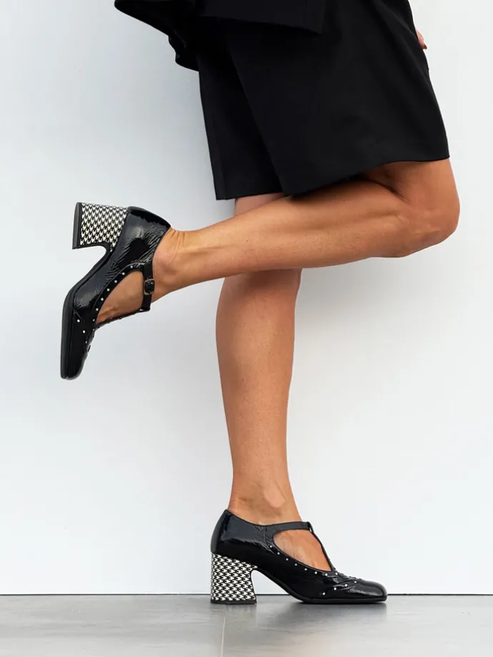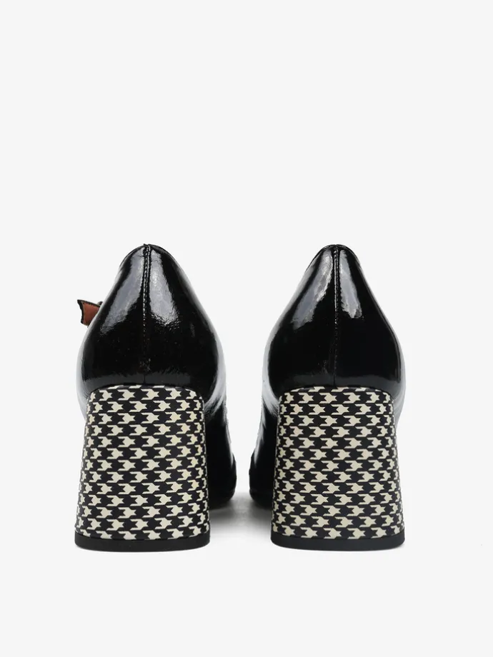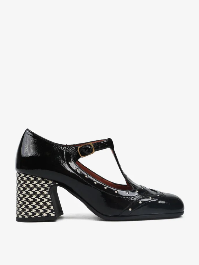 Lakierowane czółenka na wzorzystym słupku. Kwadratowe noski, szeroki pasek na podbiciu i regulowane zapięcie.
