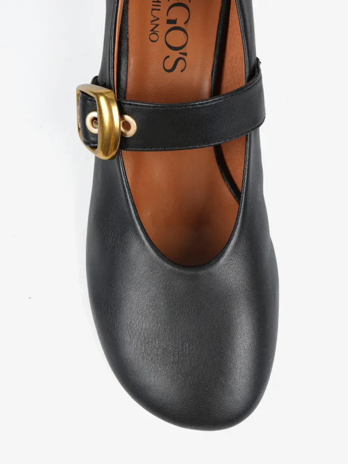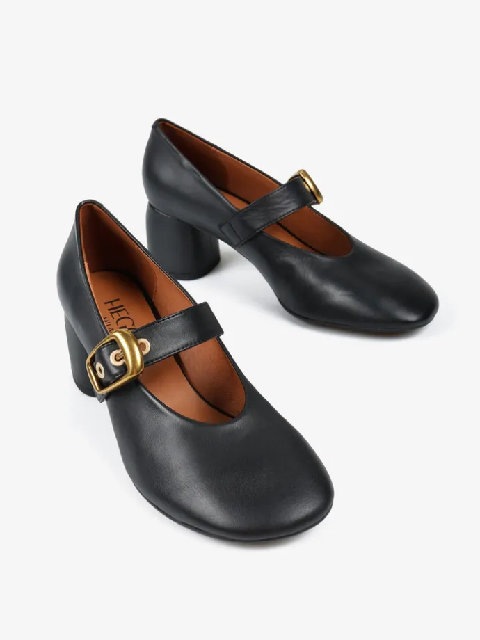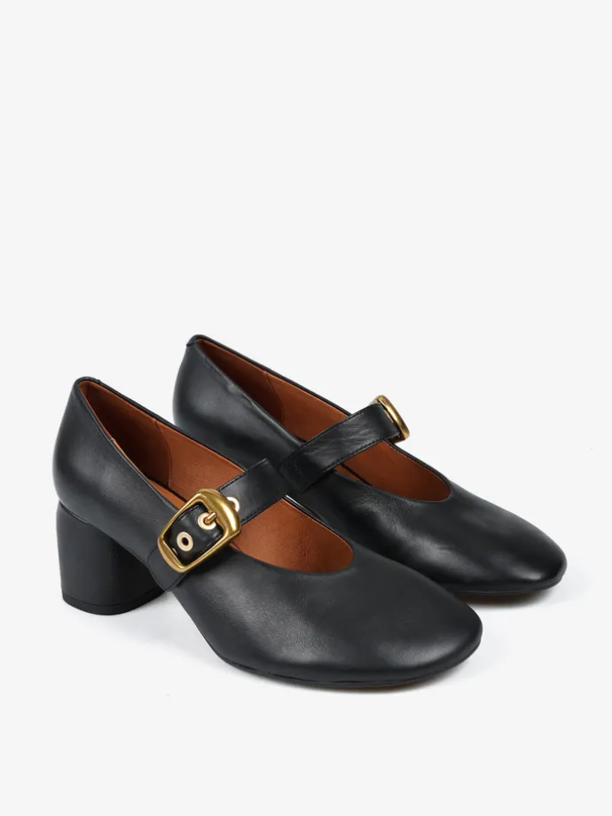 Czółenka Mary Jane na słupku. Owalne wycięcie i regulowany pasek.