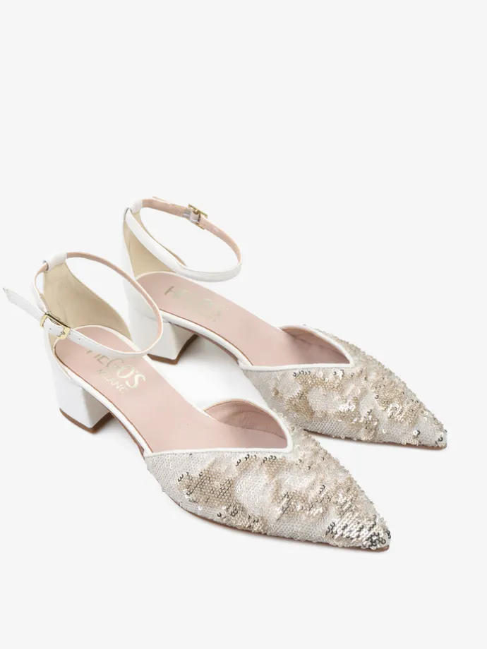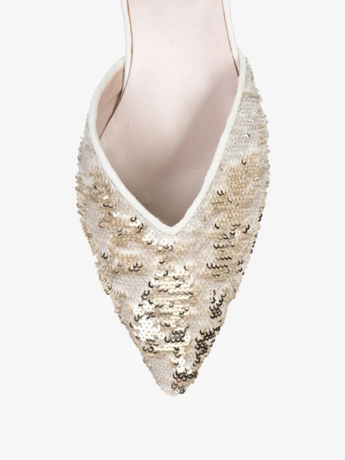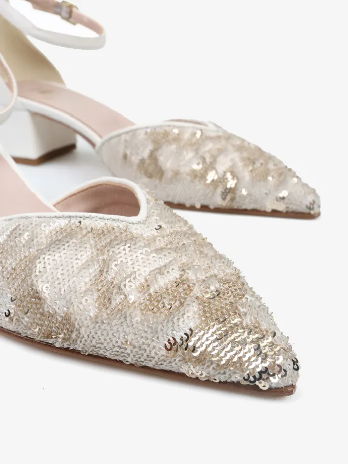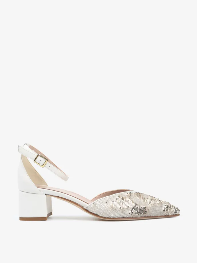 Czółenka na słupku z głębokim wycięciem i regulowanym zapięciem na kostce. Nosek w szpic wykończony dwustronnymi cekinami, które można układać.