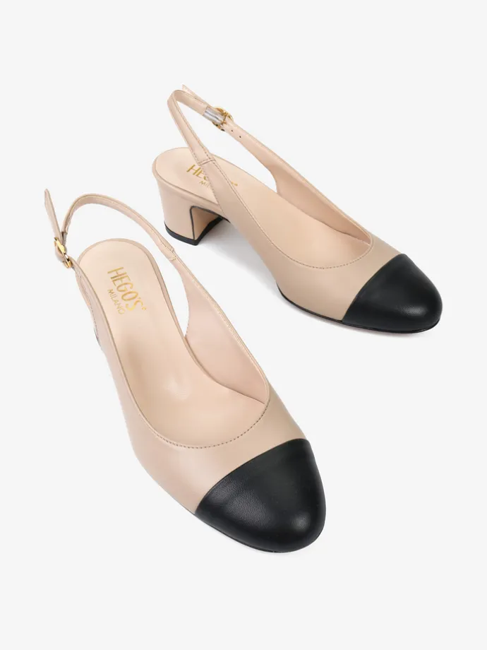 Klasyczne beżowe czółenka z okrągłym, czarnym noskiem. Odkryta pięta z regulowanym paskiem.