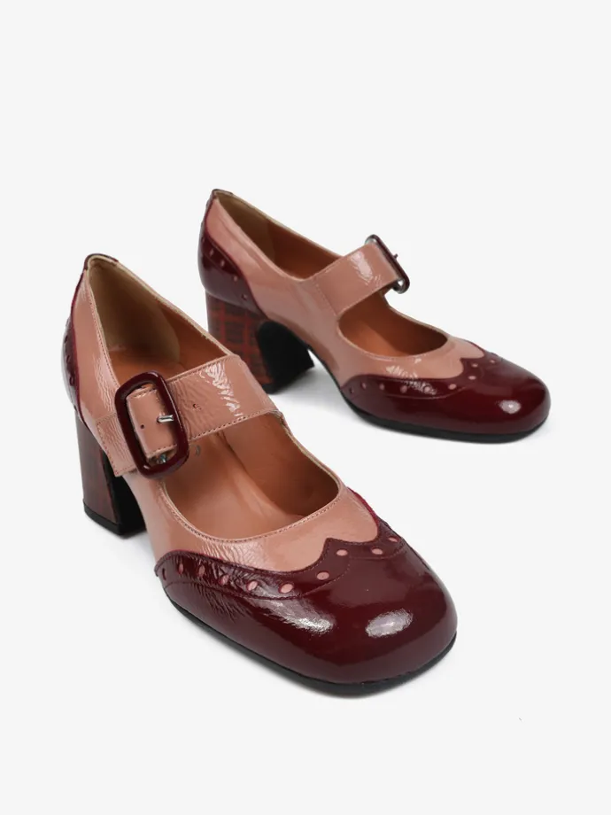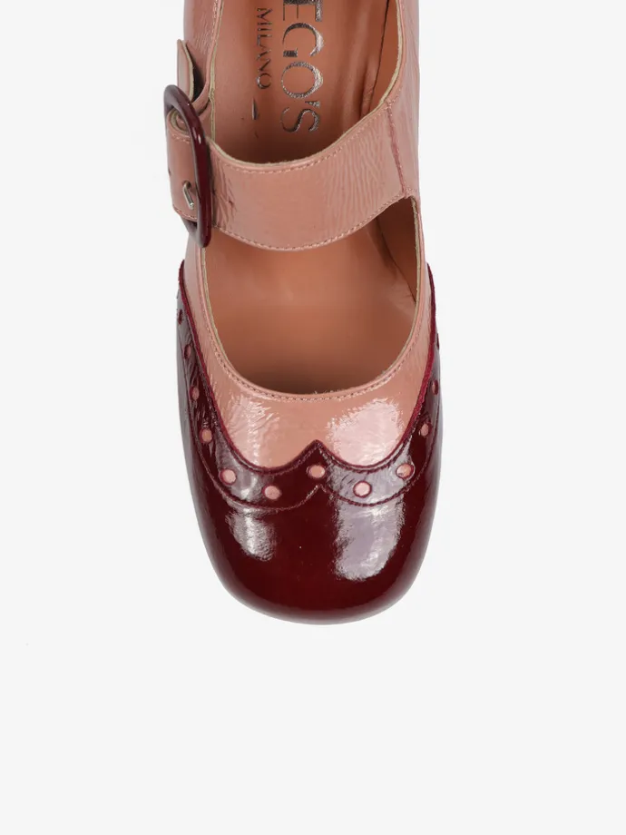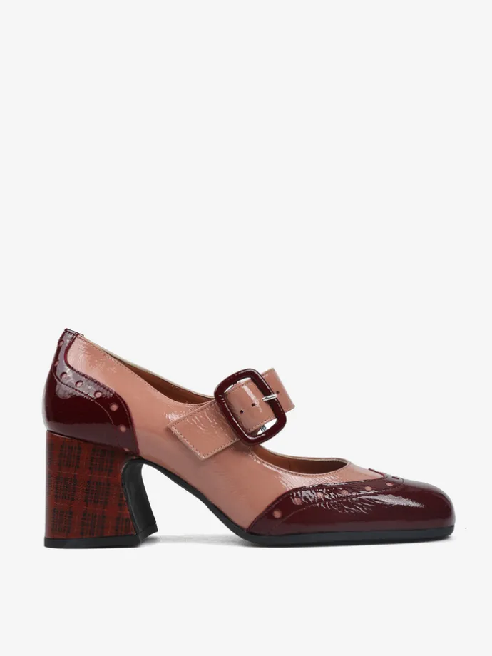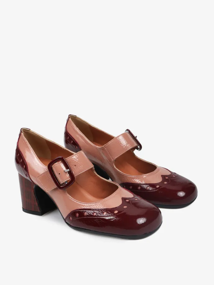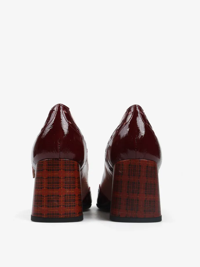 Lakierowane czółenka Mary Jane z kwadratowym noskiem i ażurowym, bordowym przeszyciem. Słupek ze wzorem w kratkę.