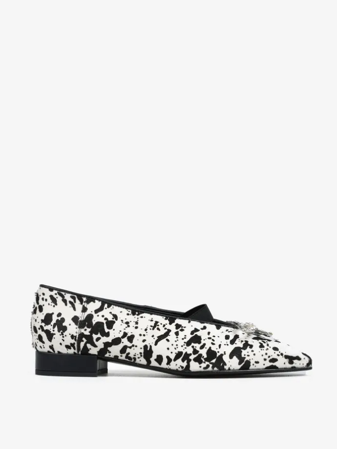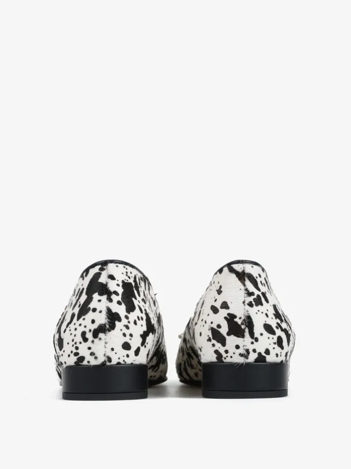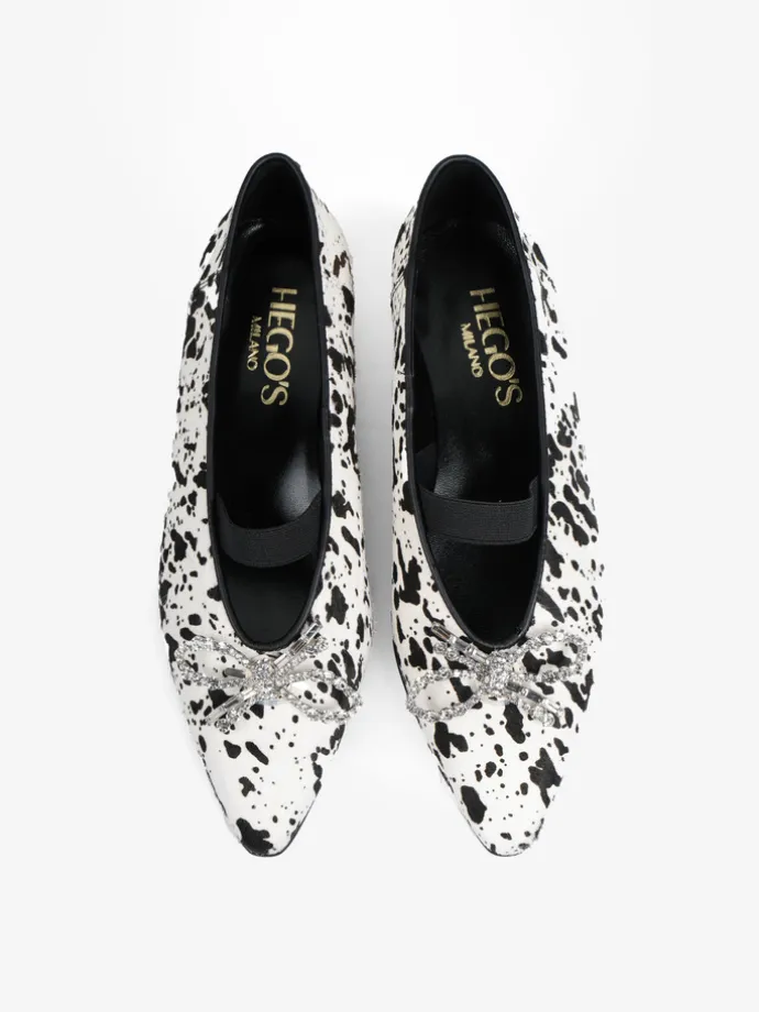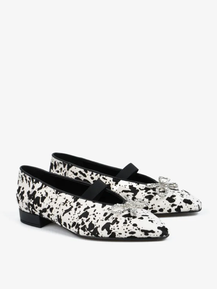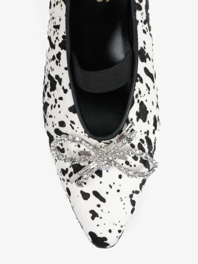 Baleriny z noskiem w szpic i gumką na podbiciu, wykonane z naturalnej skóry z włosiem. Wykończone ozdobną, biżuteryjną kokardą.
