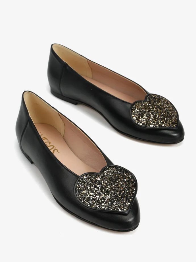Proste baleriny z owalnym wycięciem i zabudowanymi brzegami na skórzanej podeszwie. Ozdobne serce z gruboziarnistym brokatem.