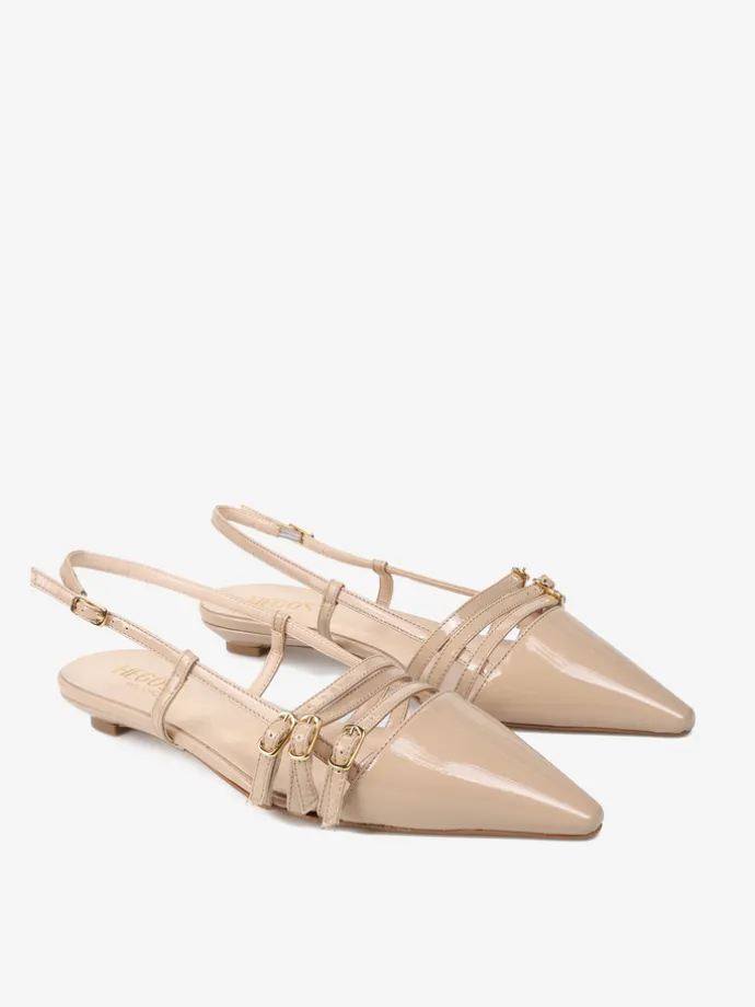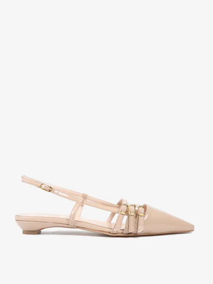 Baleriny z noskiem w szpic i odkrytą piętą z regulowanym paskiem. Ozdobne paseczki.