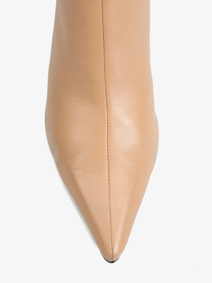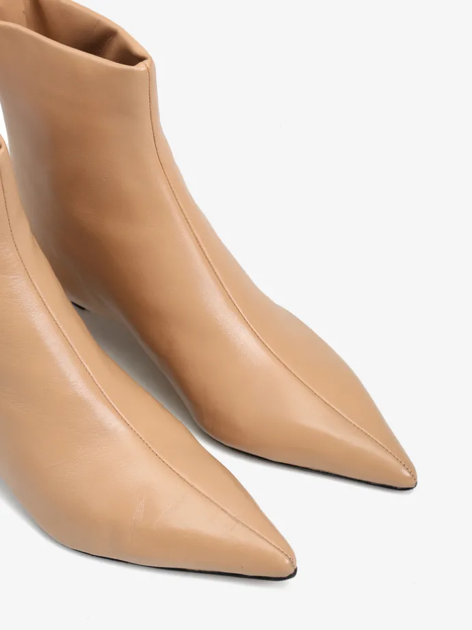 Skórzane botki na niskiej, profilowanej szpilce. Noski w szpic i zapięcie na suwak.
