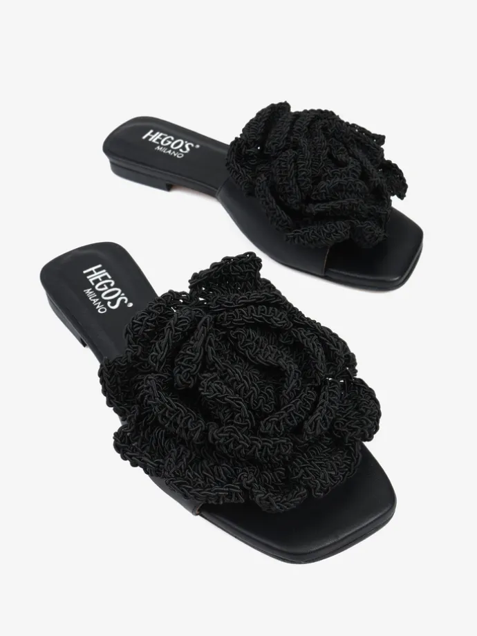 Skórzane klapki na płaskiej podeszwie z trójwymiarowym, szydełkowym kwiatem.