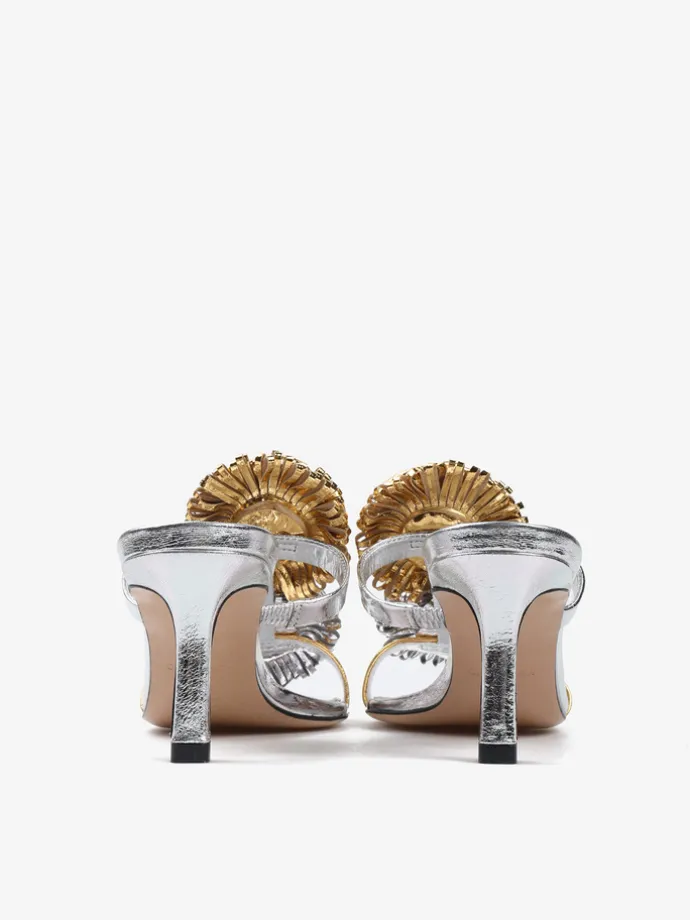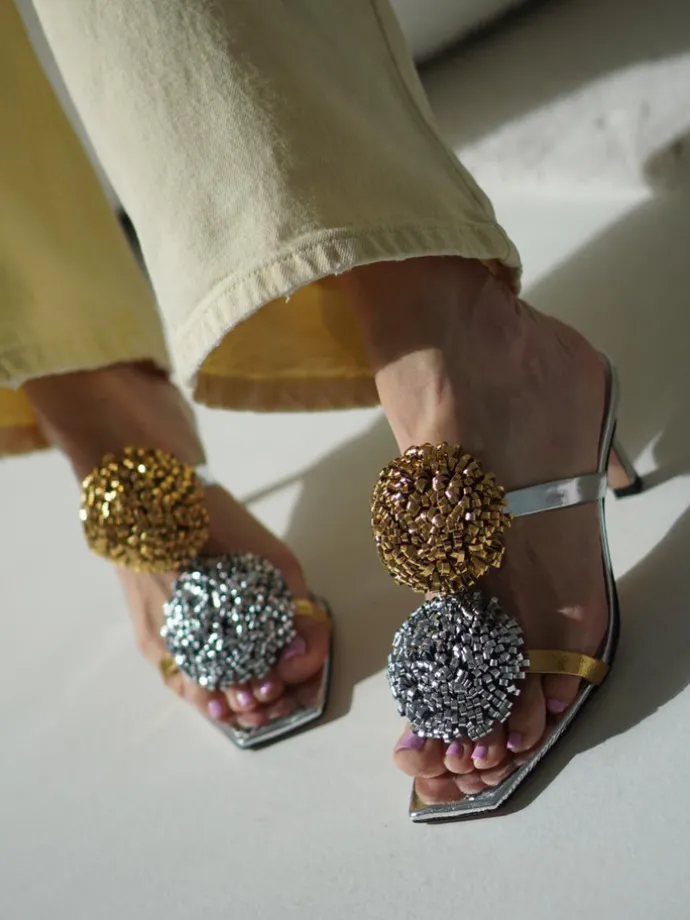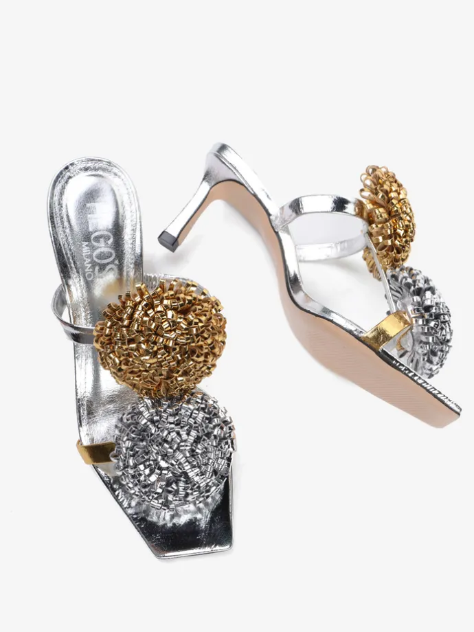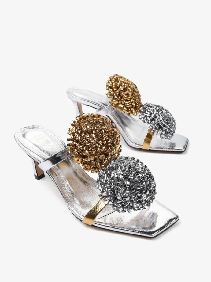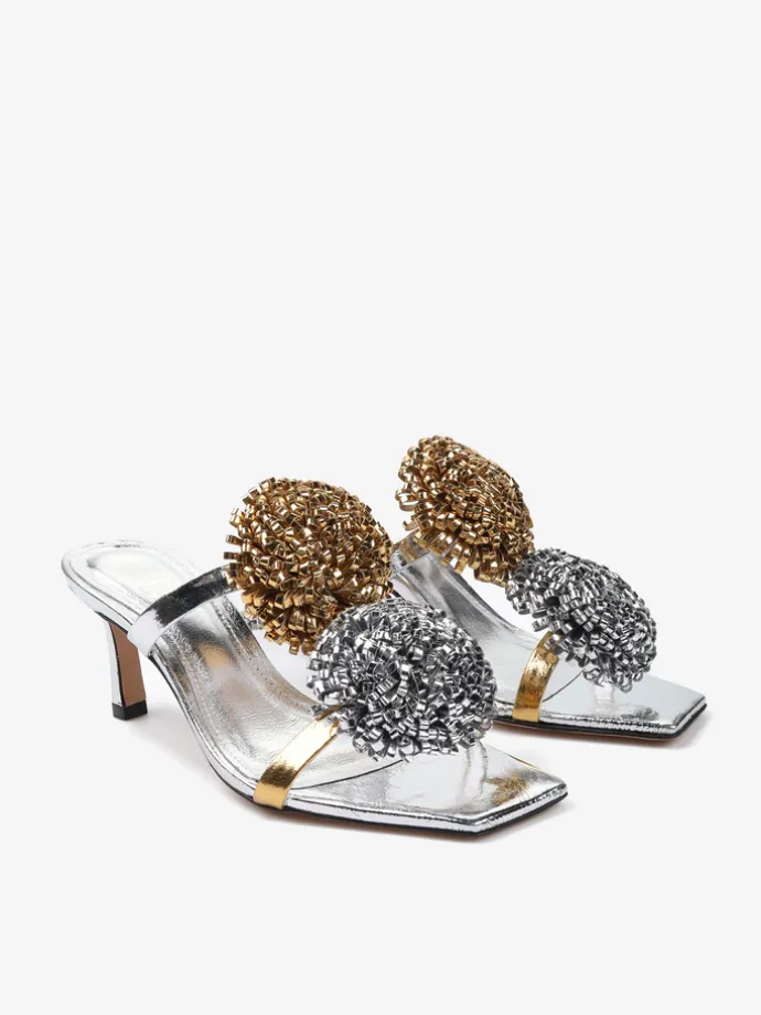 Klapki na szpilce wykonane z dwukolorowej metalizowanej skóry. Kwadratowy nosek i ozdobne pompony.