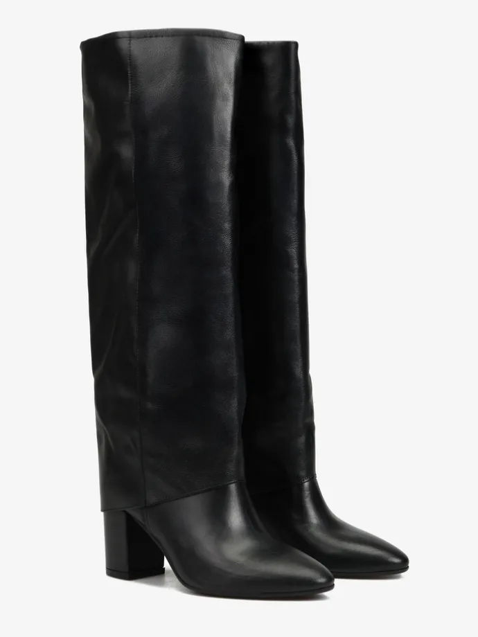 Skórzane, wsuwane kozaki na stabilnym słupku. Przedłużona cholewka.