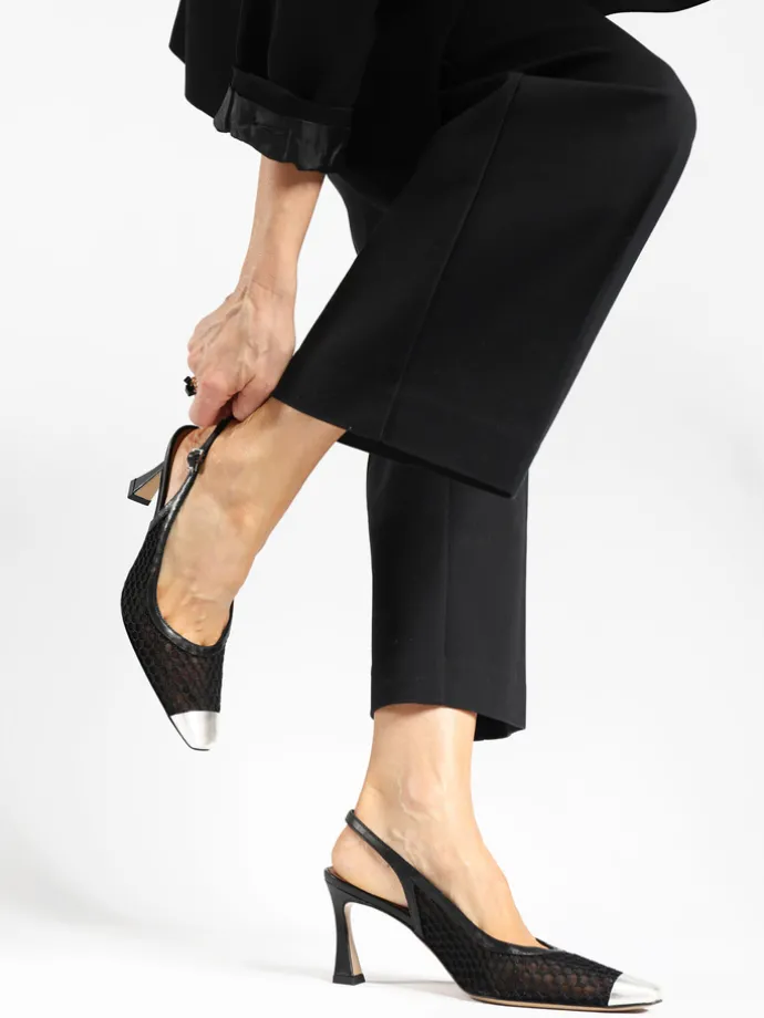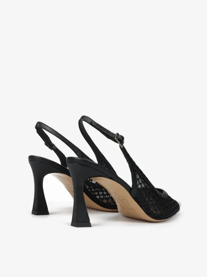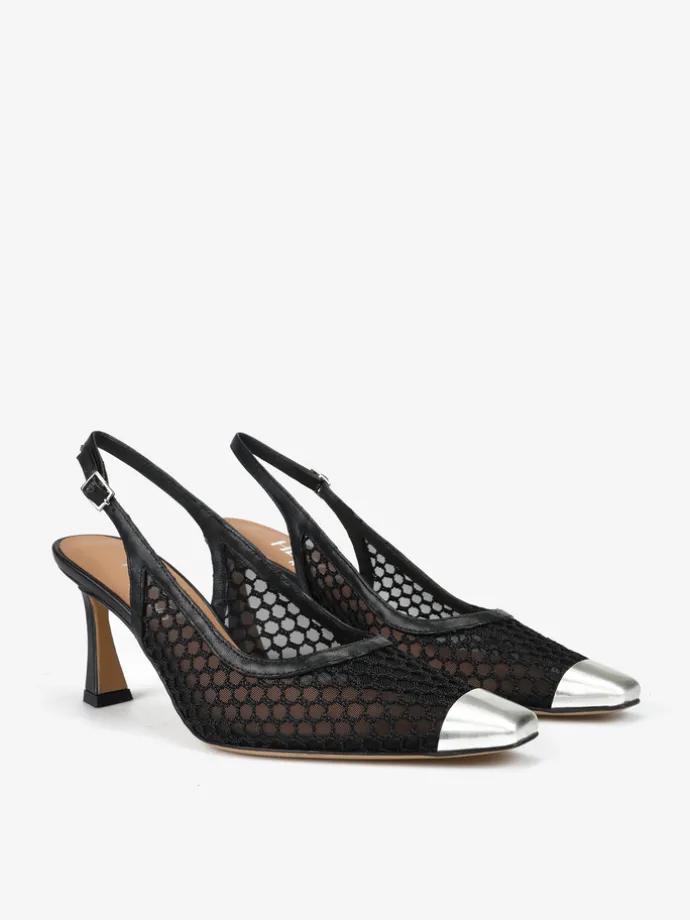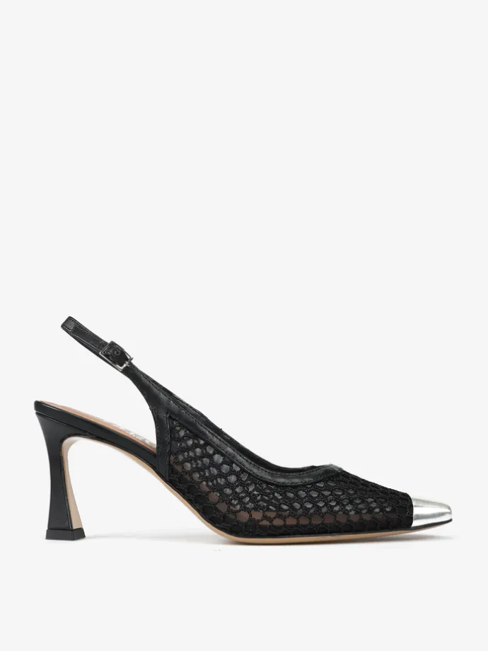 Eleganckie szpilki wykonane ze skóry i przewiewnej siateczki, z metalowym noskiem. Odkryta pięta z regulowanym paskiem.