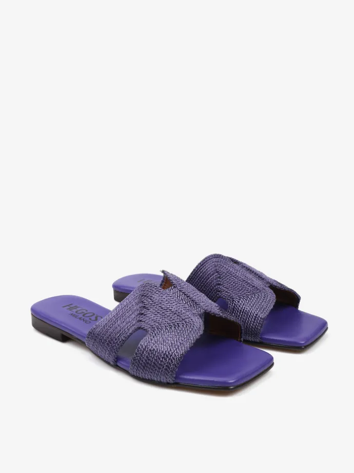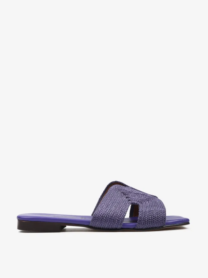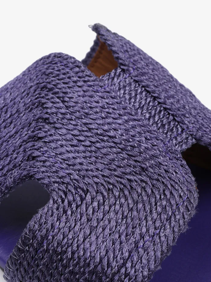 Modne klapki na płaskiej podeszwie z paskiem wykonanym ze sznurka.