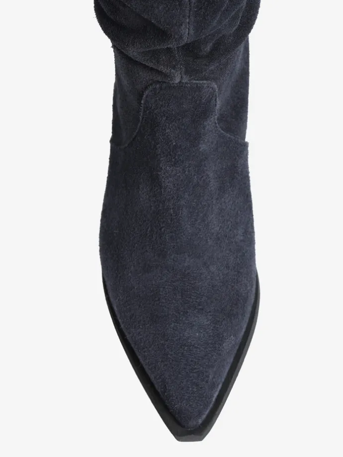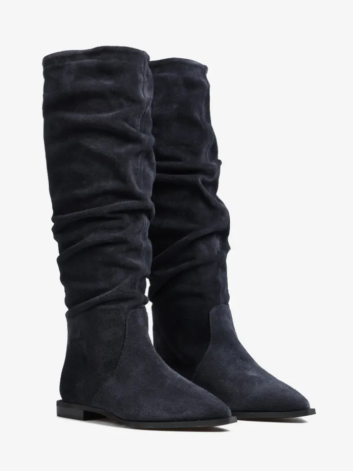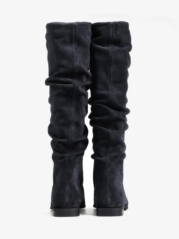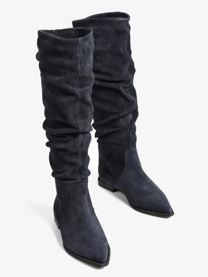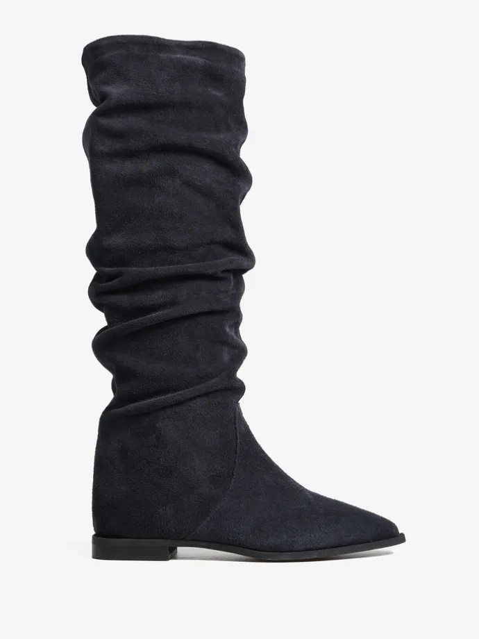 Zamszowe, wsuwane kozaki z noskami w szpic i marszczonymi cholewkami.