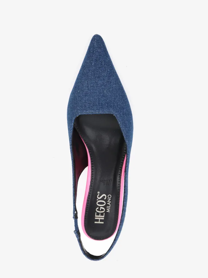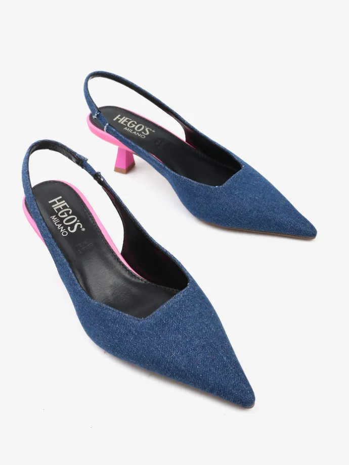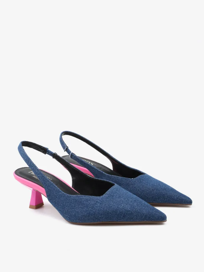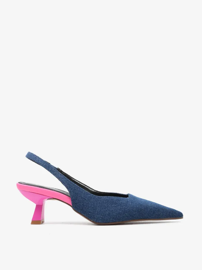 Jeansowe czółenka na neonowej szpilce. Nosek w szpic i odkryta pięta z paskiem dopasowującym się do stopy.