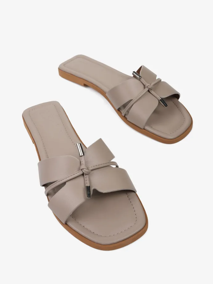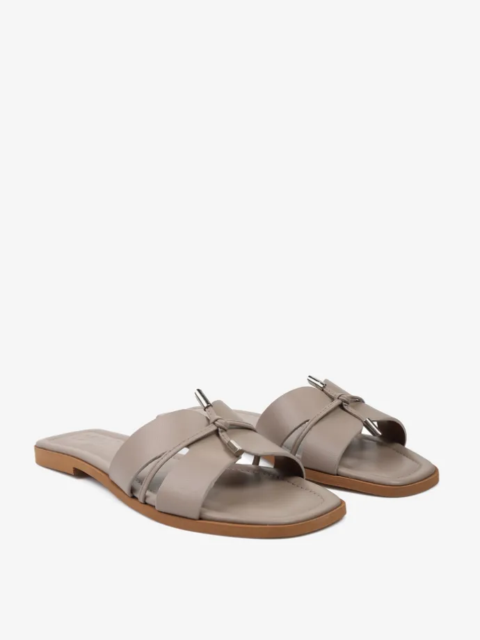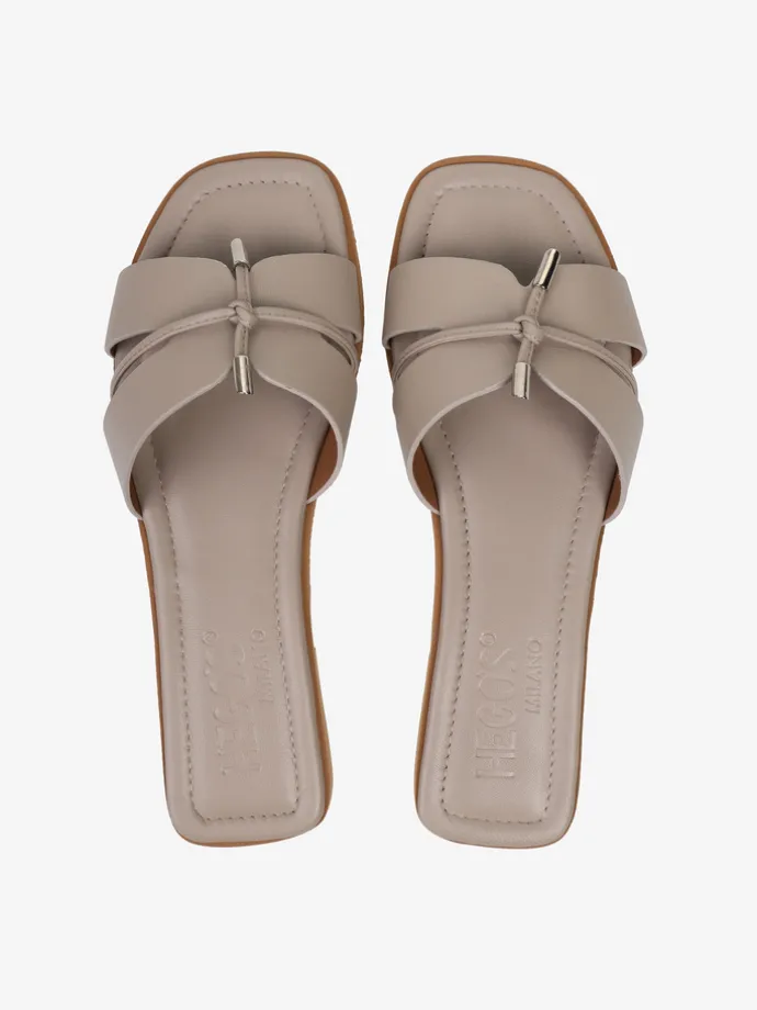 Modne klapki wykonane z miękkiej, delikatnej skóry. Ozdobne wiązanie ze skórzanego sznurka wykończonego metalowymi skuwkami.