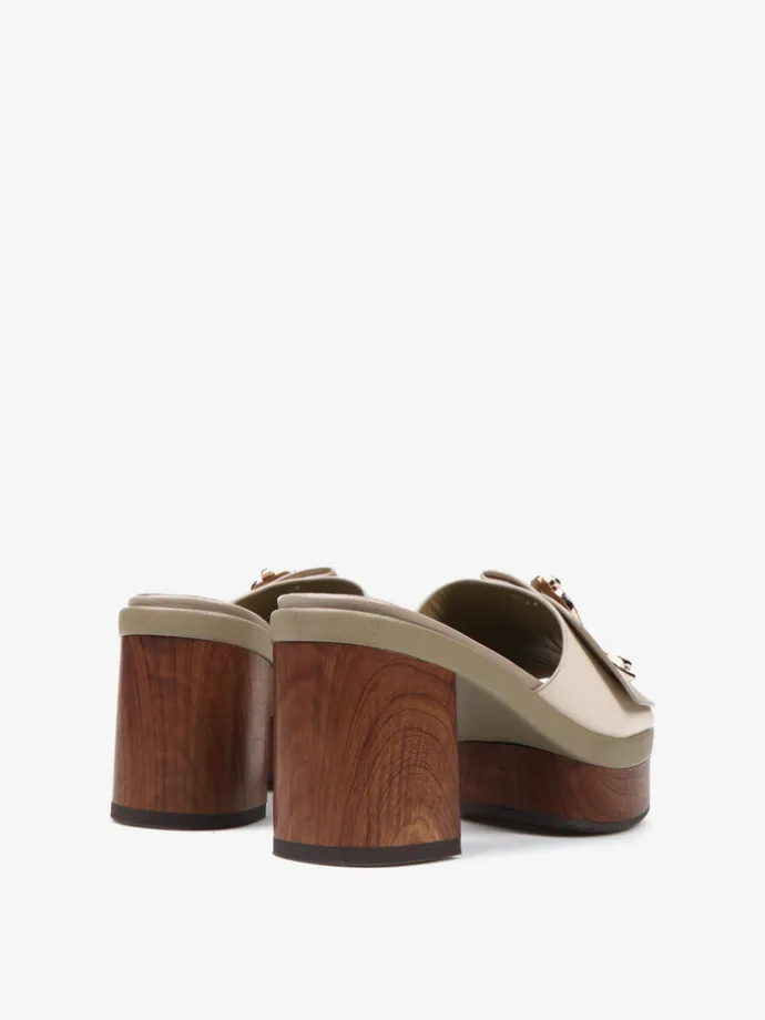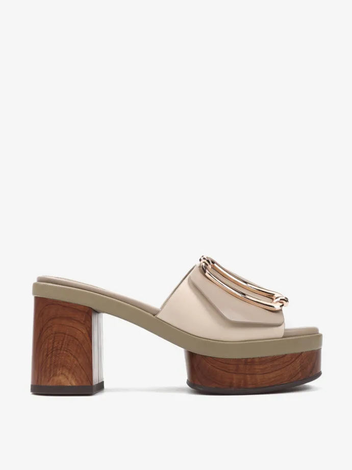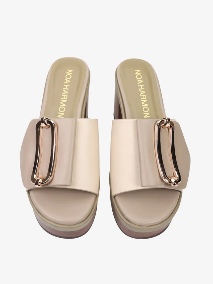 Klapki NOA HARMON z szerokim paskiem i ozdobną klamrą. Obcas i platforma z efektem drewna.
