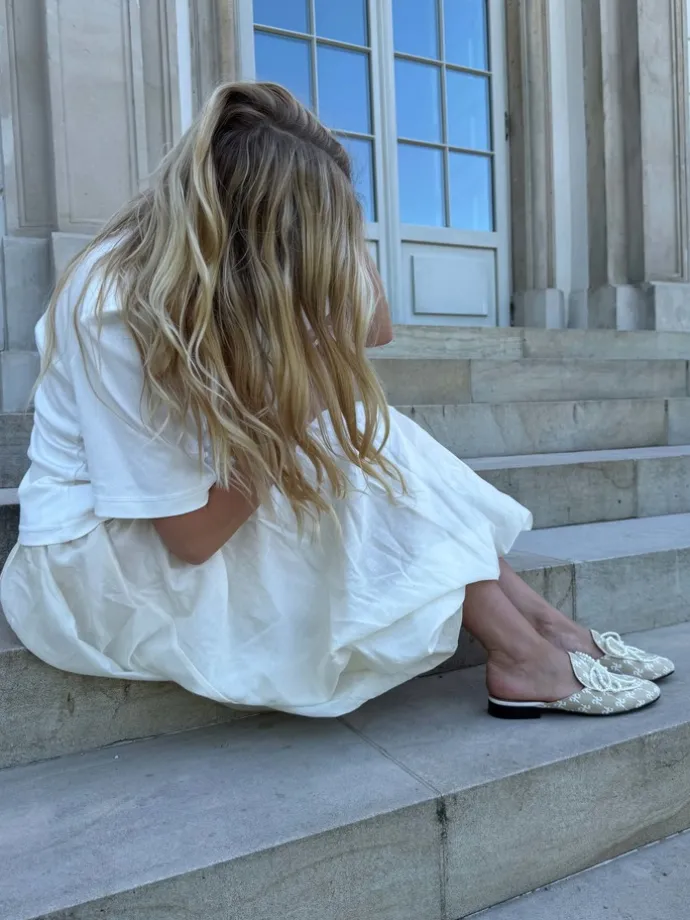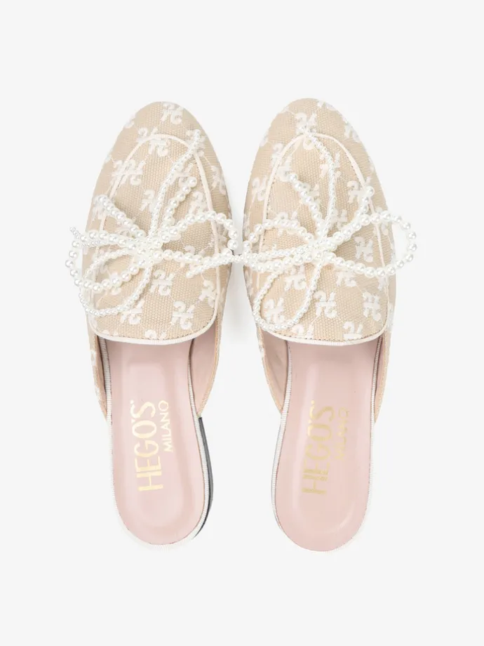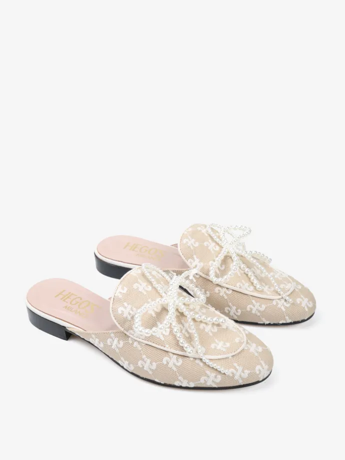 Materiałowe mule z haftowanym monogramem i kokardką z pereł.